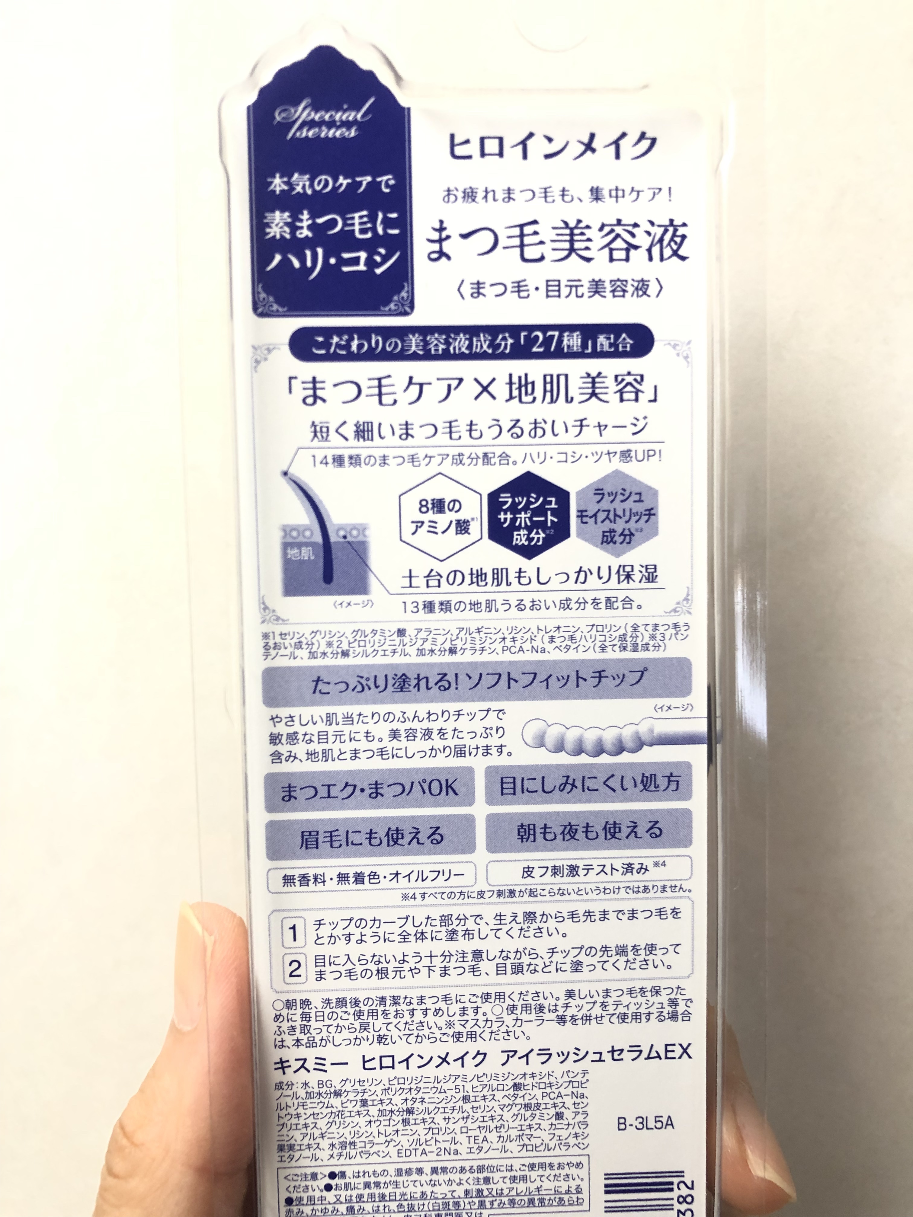 - ●こだわりの27種の美容液成分(全て保湿成分)配合。本気のケアで素まつ毛にハリ・コシを。 ●たっぷり塗れる!ソフトフィットチップを採用。液含みがよく、やさしい肌当たりのふんわりチップで、地肌とまつ毛にしっかりと塗布することができます。 ●まつエク・まつパOK ●眉毛にも使える ●目にしみにくい処方 ●無香料・無着色・オイルフリー ●皮フ刺激テスト※済み ※ すべての方に皮フ刺激が起こらないというわけではありません。