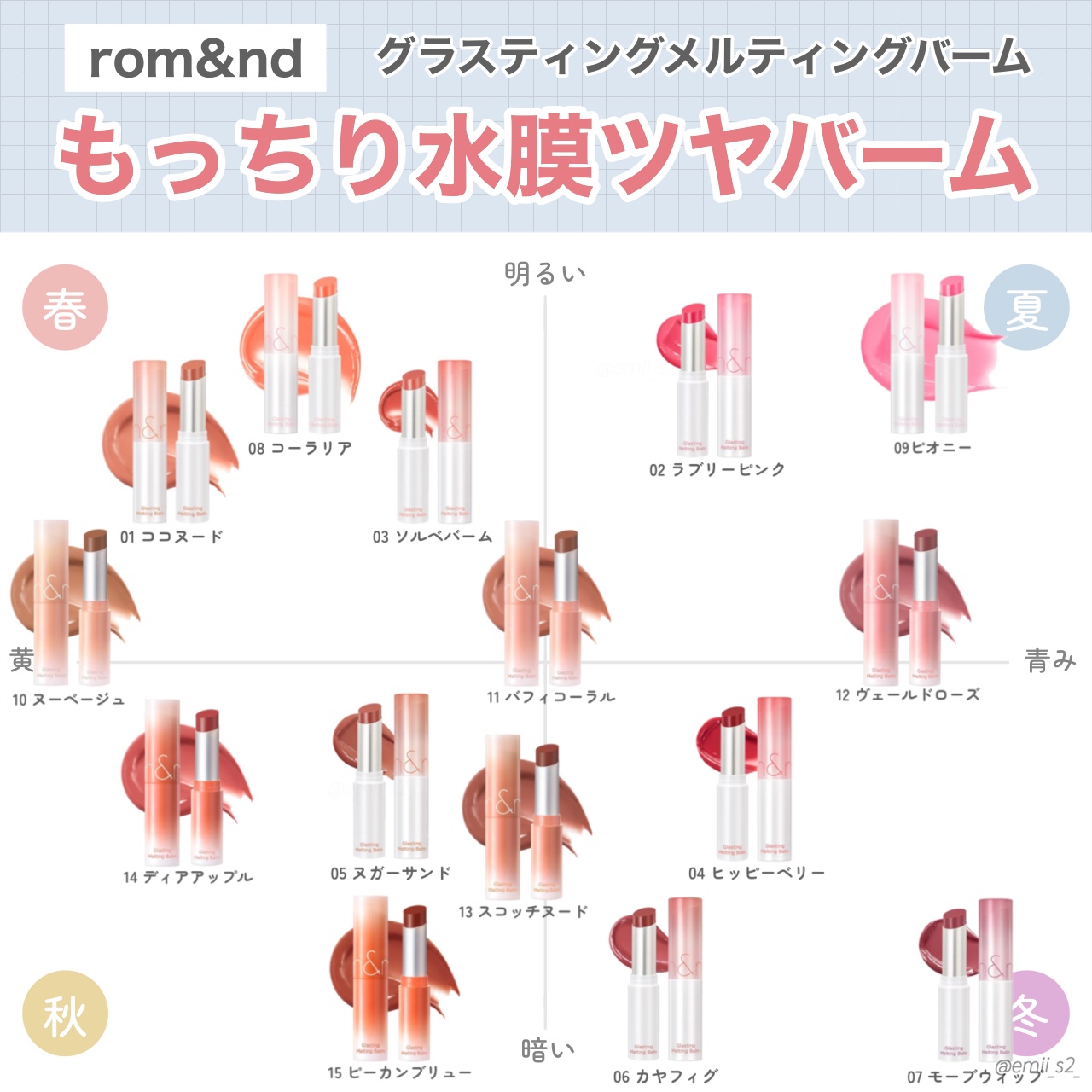 【2023年最新版】大人気ロムアンドリップをパーソナルカラー分類💄保存推奨です🕊️\現時点で全35色/ミニサイズや新色が出た時は、この投稿に追加します!🗒️参考になれば嬉しいです♡rom&ndジューシーラスティングティント01 ジューシーオー...
