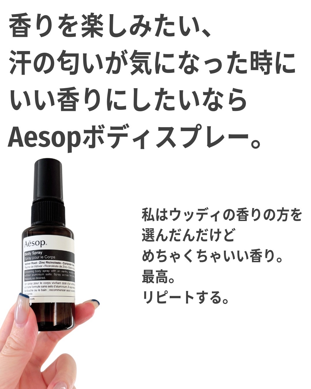 Aesopボディスプレー14リフレッシュできる爽快な感じの香りに感じます。11種類のエッセンシャルオイルを配合。[公式より]アロマウッディ、ハーバル、アーシー特徴爽やかな香りが続く、持ち運びにも便利な軽量のボディスプレー。主要成分ベチバールー...