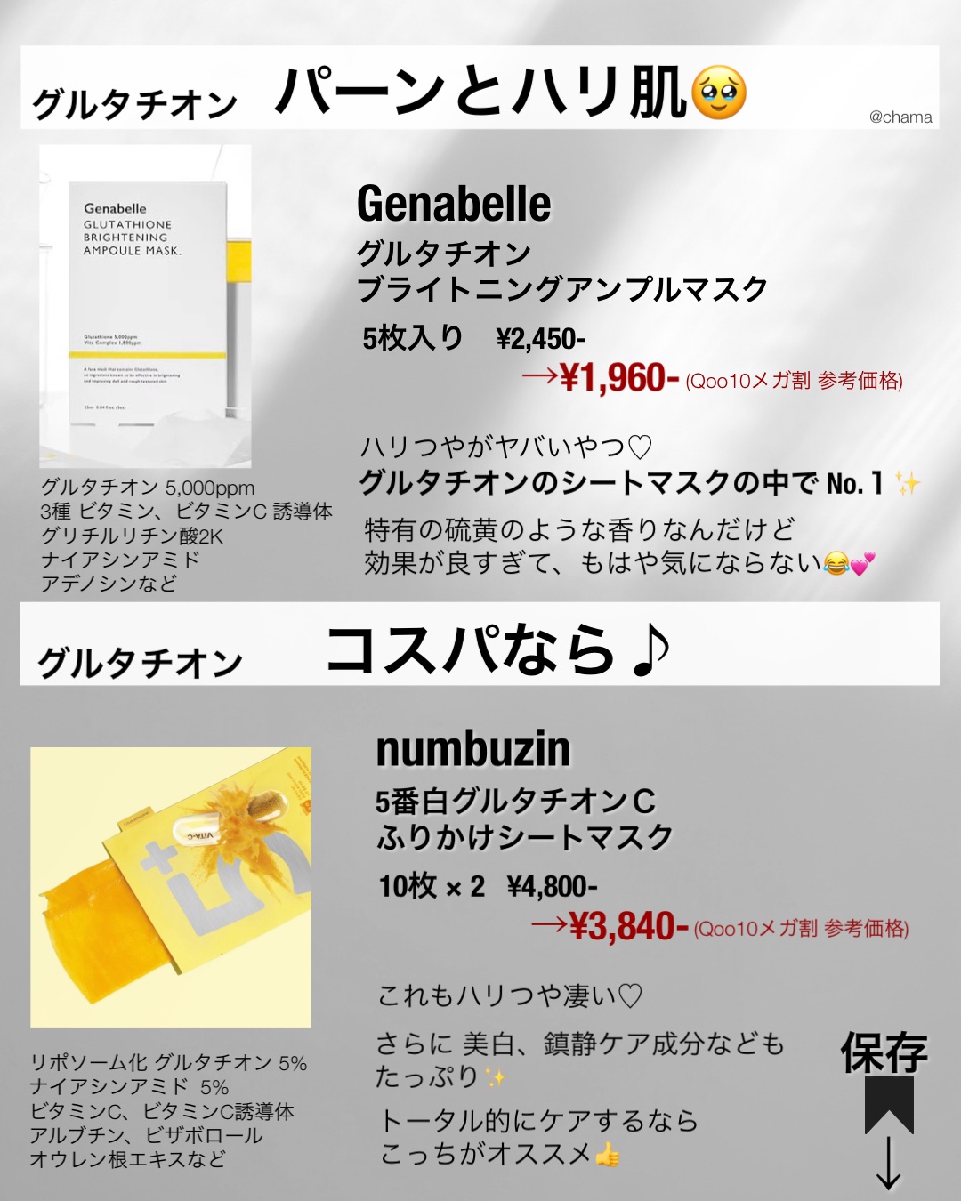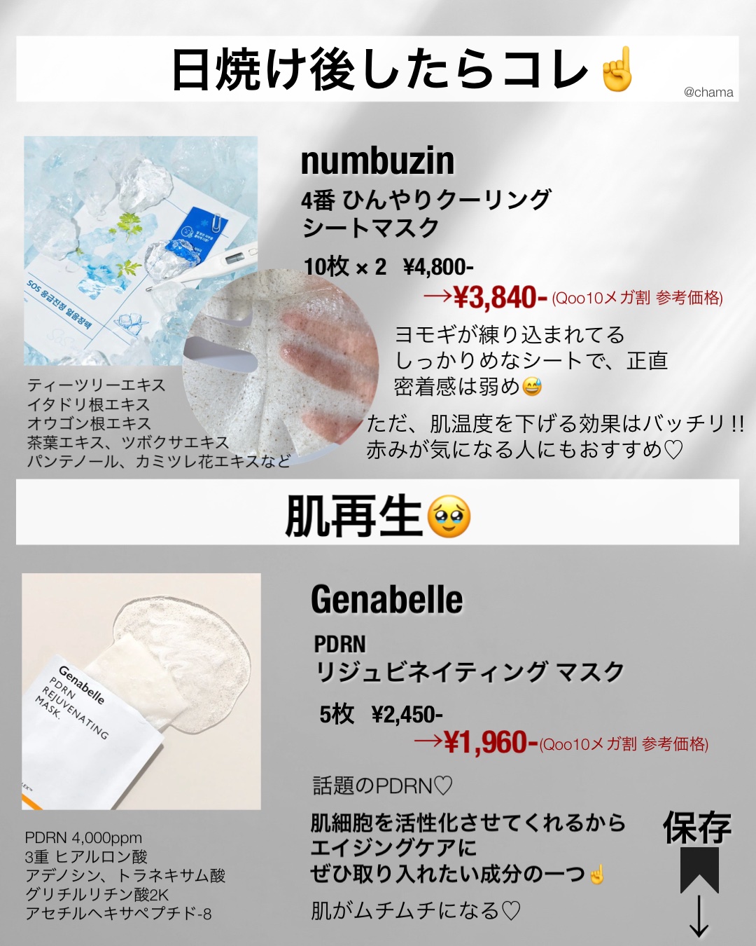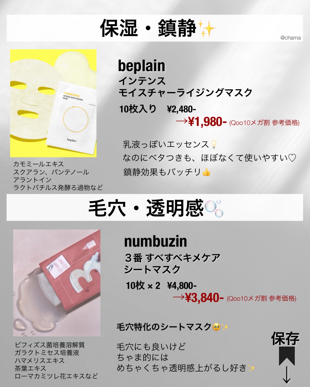 【1番 ヒノキ水81%シートマスク】 鎮静系で水分を入れ込むことによって肌トラブルを落ち着かせ潤いのある肌に導いてくれる☝️ 【2番 うるもち65%コラーゲンシートマスク】 保湿に特化♪ 特に乾燥肌の方におすすめ✨ 【3番 すべすべキメケアシートマスク】 耐えればすべすべのお肌に と言われていてピリピリに耐えるとお肌がすべすべモチモチになるんだとか❤️ 【4番 ひんやりクーリングシートマスク】 こちらも鎮静系でクーリングが凄い✨ めちゃくちゃひんやりするから夏に使いたい♪