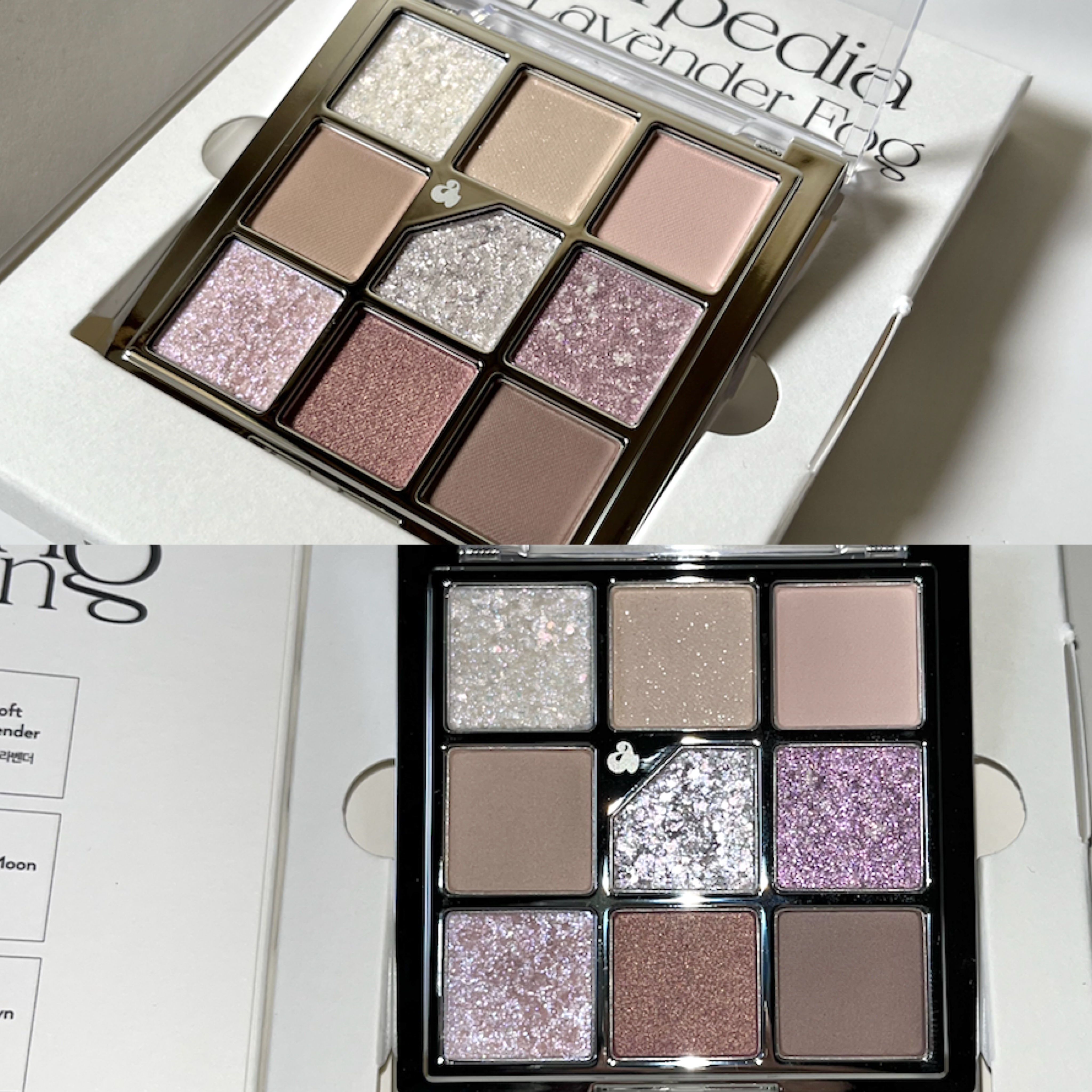 ラメ好きにはたまらないアンリシアのラベンダーパレット🎨💜 No.4 オールラベンダーフォグはくすみのあるグレーやラベンダーカラーを中心とした配色で、大小様々なグリッターやラメも入っているので色んなメイクが出来そう! 目元にのせると見た目より派手さはないので普段使いにも◎
