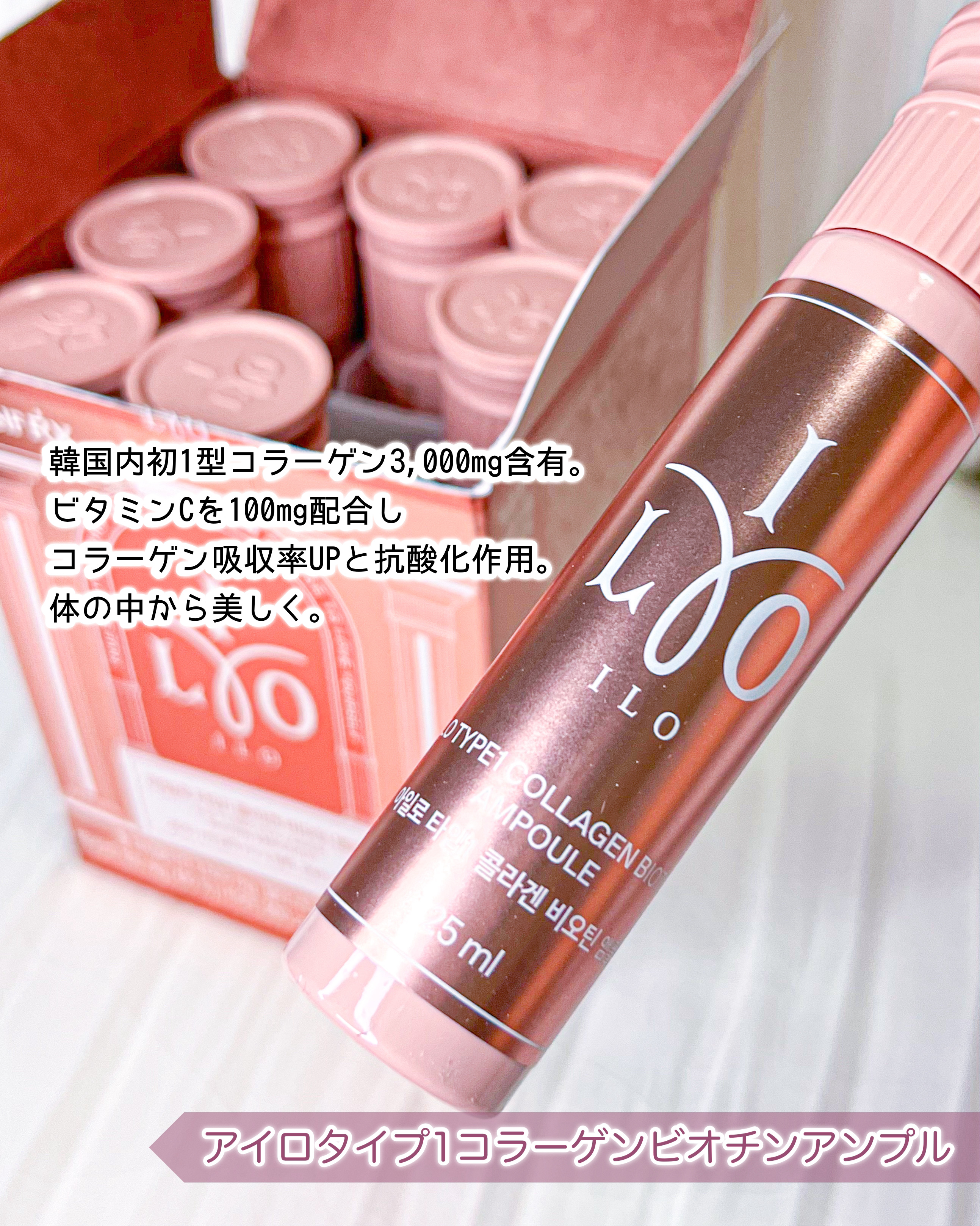 アイロホワイタチオン グルタチオン・ビタミンC・ビタミンEとホワイトトマトが配合された飲む日焼け止め💖 ホワイトトマトとはフィトエン&フィトフルエン含有量を豊富に配合しており、一般のトマトの5倍紫外線対策が出来る凄いトマトで、抗酸化・メラニン合成を抑制して肌のトーンをトーンアップしてくれるみたい💡 2024年7月オリーブヤング全体ランキング1位を獲得した飲むコラーゲン。I型コラーゲンは真皮の90%を構成するコラーゲンでアイロタイプⅠコラーゲンビオチンアンプルにはⅠ型コラーゲンが3000mgも配合😳