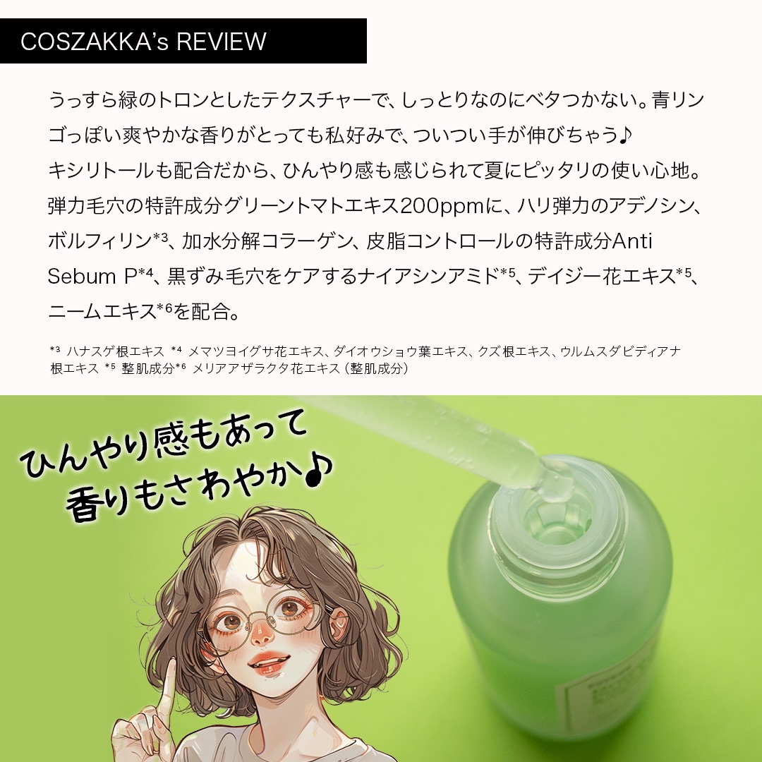 - ‐ 皮膚刺激性テスト済み(*全ての方に皮膚刺激が発生しないということではありません) ‐ 低刺激な使い心地、天然成分をたっぷり込めた全成分EWGグリーン等級の「トマトアンプル」 ‐ 独自のグリーントマト成分(保湿)が肌にハリと弾力を与え乾燥による毛穴の目立ちをケア ‐ 独自のアンチセバムP成分(整肌)が皮脂バランスを整え皮脂による毛穴の目立ちをケア ‐ 5種類の保湿成分を配合し、肌の表面から角質層まできめ細かく水分を補給 ‐ ハリケア、整肌ケアにアプローチする原料配合