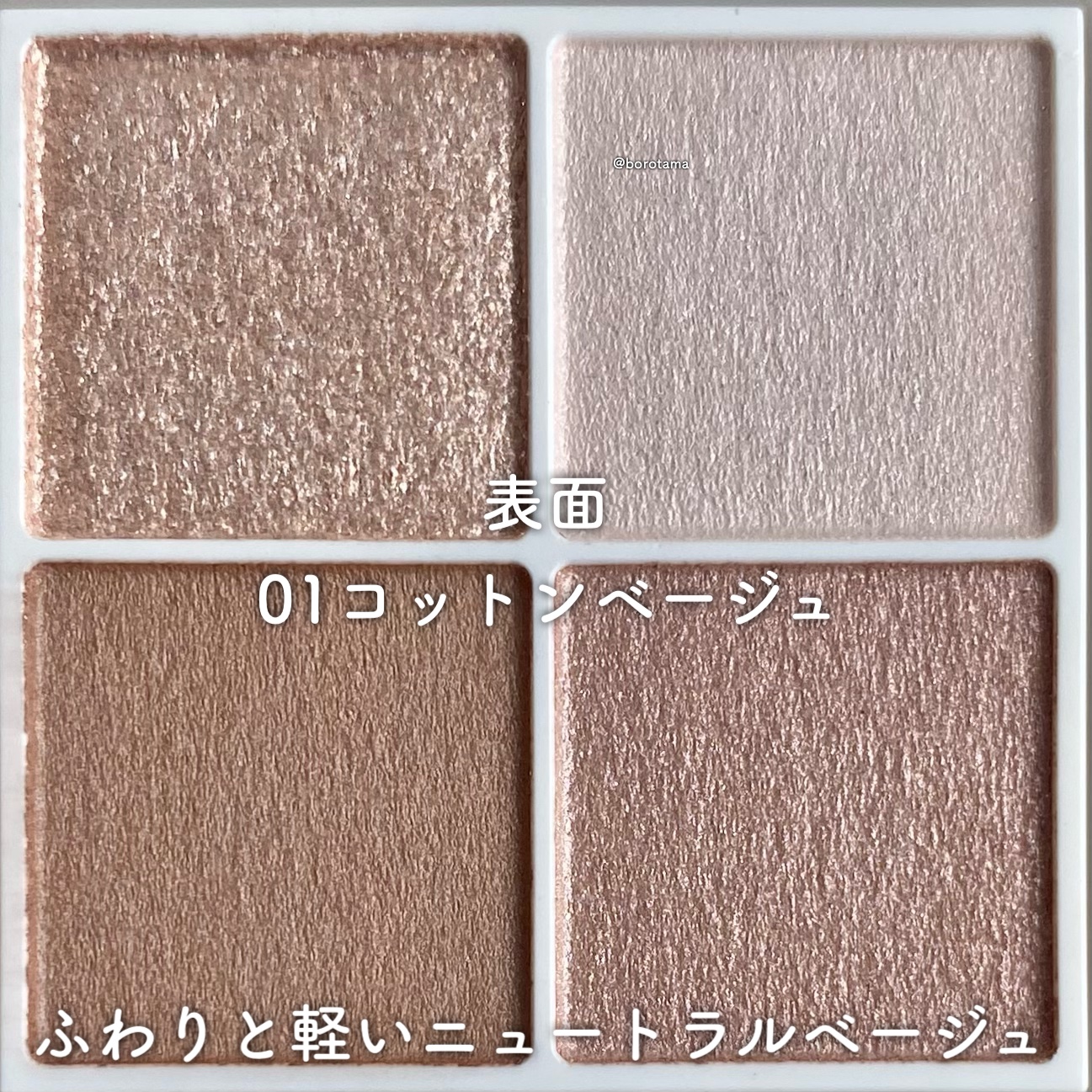 - ≪01 コットンベージュ≫ 〈A〉ジメチコン、タルク、トリ(カプリル酸/カプリン酸)グリセリル、(ジメチコン/ビニルジメチコン)クロスポリマー、カルナウバロウ、ラウロイルリシン、トコフェロール、スクワラン、ホホバ種子油、ホウケイ酸(Ca/Al)、マイカ、酸化チタン、酸化鉄 〈BCD〉タルク、リンゴ酸ジイソステアリル、ジメチコン、ジエチルヘキサン酸ネオペンチルグリコール、シリカ、ヘキサ(ヒドロキシステアリン酸/ステアリン酸/ロジン酸)ジペンタエリスリチル、クロルフェネシン、デヒドロ酢酸Na、セスキイソステアリン酸ソルビタン、ミリスチン酸亜鉛、水酸化Al、トコフェロール、スクワラン、ホホバ種子油、マイカ、酸化チタン、酸化鉄、ホウケイ酸(Ca/Al)、グンジョウ、酸化スズ ≪02 シェリーピンク≫ 〈A〉ジメチコン、タルク、(ジメチコン/ビニルジメチコン)クロスポリマー、トリ(カプリル酸/カプリン酸)グリセリル、カルナウバロウ、ラウロイルリシン、シリカ、トコフェロール、スクワラン、ホホバ種子油、ホウケイ酸(Ca/Al)、マイカ、酸化チタン、酸化鉄、酸化スズ、グンジョウ、コンジョウ 〈BCD〉タルク、リンゴ酸ジイソステアリル、ジメチコン、ジエチルヘキサン酸ネオペンチルグリコール、シリカ、ヘキサ(ヒドロキシステアリン酸/ステアリン酸/ロジン酸)ジペンタエリスリチル、クロルフェネシン、デヒドロ酢酸Na、セスキイソステアリン酸ソルビタン、ミリスチン酸亜鉛、水酸化Al、トコフェロール、スクワラン、ホホバ種子油、マイカ、酸化チタン、酸化鉄、ホウケイ酸(Ca/Al)、グンジョウ、赤226 ≪03 ムーンアメジスト≫ 〈A〉ジメチコン、タルク、(ジメチコン/ビニルジメチコン)クロスポリマー、トリ(カプリル酸/カプリン酸)グリセリル、カルナウバロウ、ラウロイルリシン、トコフェロール、スクワラン、ホホバ種子油、ホウケイ酸(Ca/Al)、マイカ、酸化チタン、酸化鉄 〈BCD〉タルク、リンゴ酸ジイソステアリル、ジメチコン、ジエチルヘキサン酸ネオペンチルグリコール、シリカ、ヘキサ(ヒドロキシステアリン酸/ステアリン酸/ロジン酸)ジペンタエリスリチル、クロルフェネシン、デヒドロ酢酸Na、セスキイソステアリン酸ソルビタン、ミリスチン酸亜鉛、水酸化Al、トコフェロール、スクワラン、ホホバ種子油、マイカ、酸化チタン、酸化鉄、ホウケイ酸(Ca/Al)、グンジョウ、赤226、酸化スズ