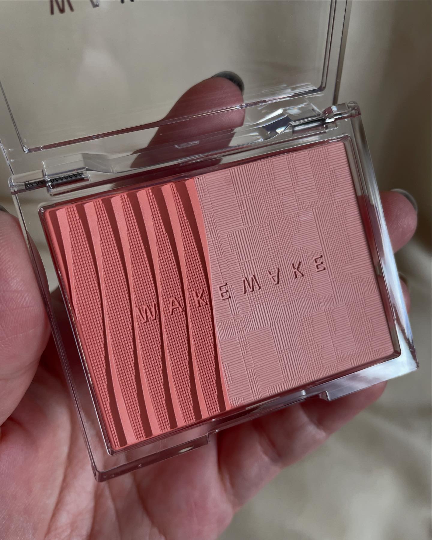 WAKEMAKE SHEER LAYERING DUAL BLUSHER 09ラベンダーシェイク 999円でチーク&ポイントメイクにピッタリなハイライト付き♡ 絶妙なふんわり発色でチーク事故起こりにくい。ほんと可愛いモーヴラベンダーでふんわり透明感のある血色感。 いい感じに透明感と血色感が共存しててこのチーク好き♡