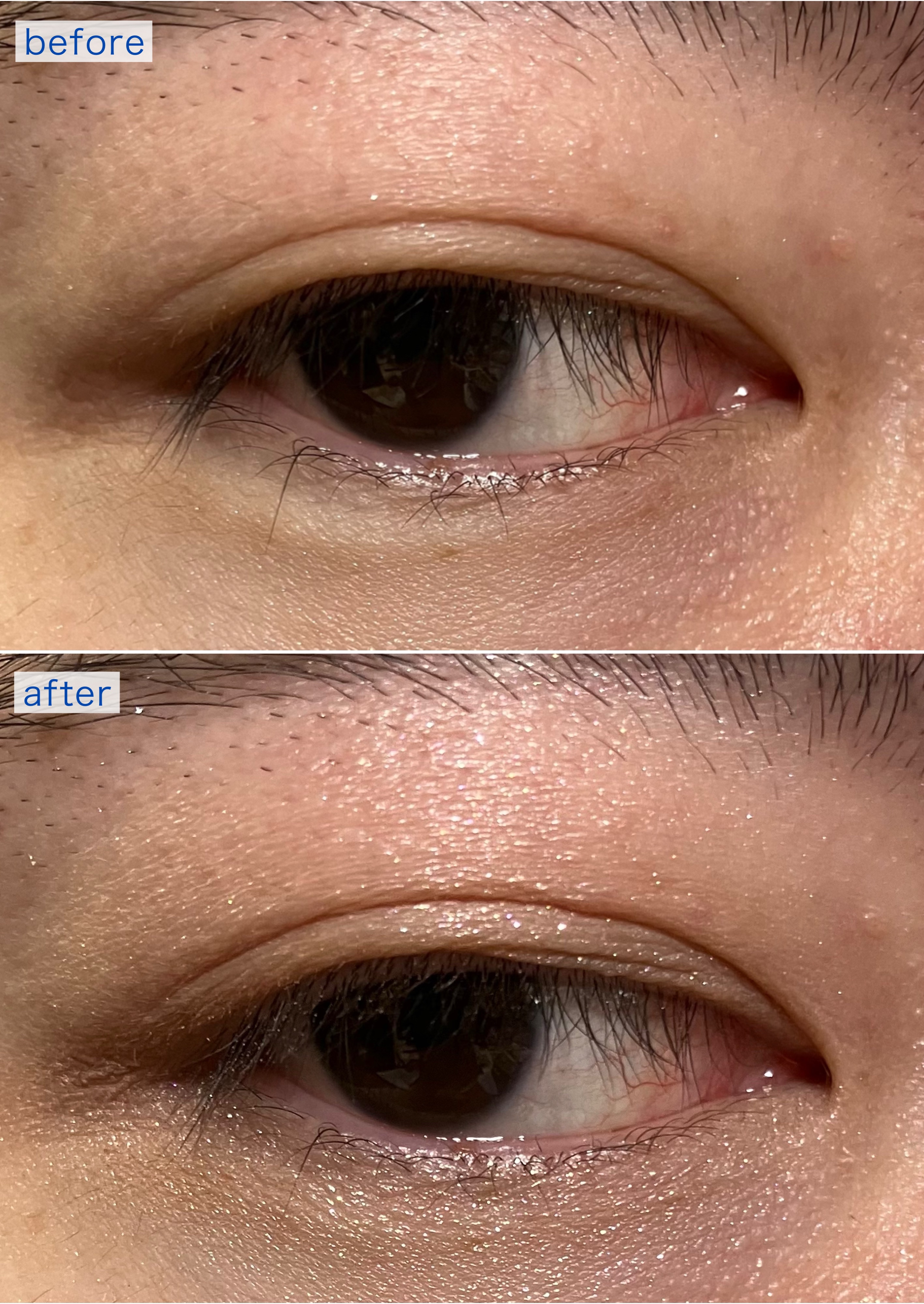 ラメ ピンク、白、ベージュなどの色が混ざっているように思います。 セミマット 青みも黄みもない淡いベージュです。わずかにパール感があります。 Cを上瞼の目尻のみにライン状に塗布します。