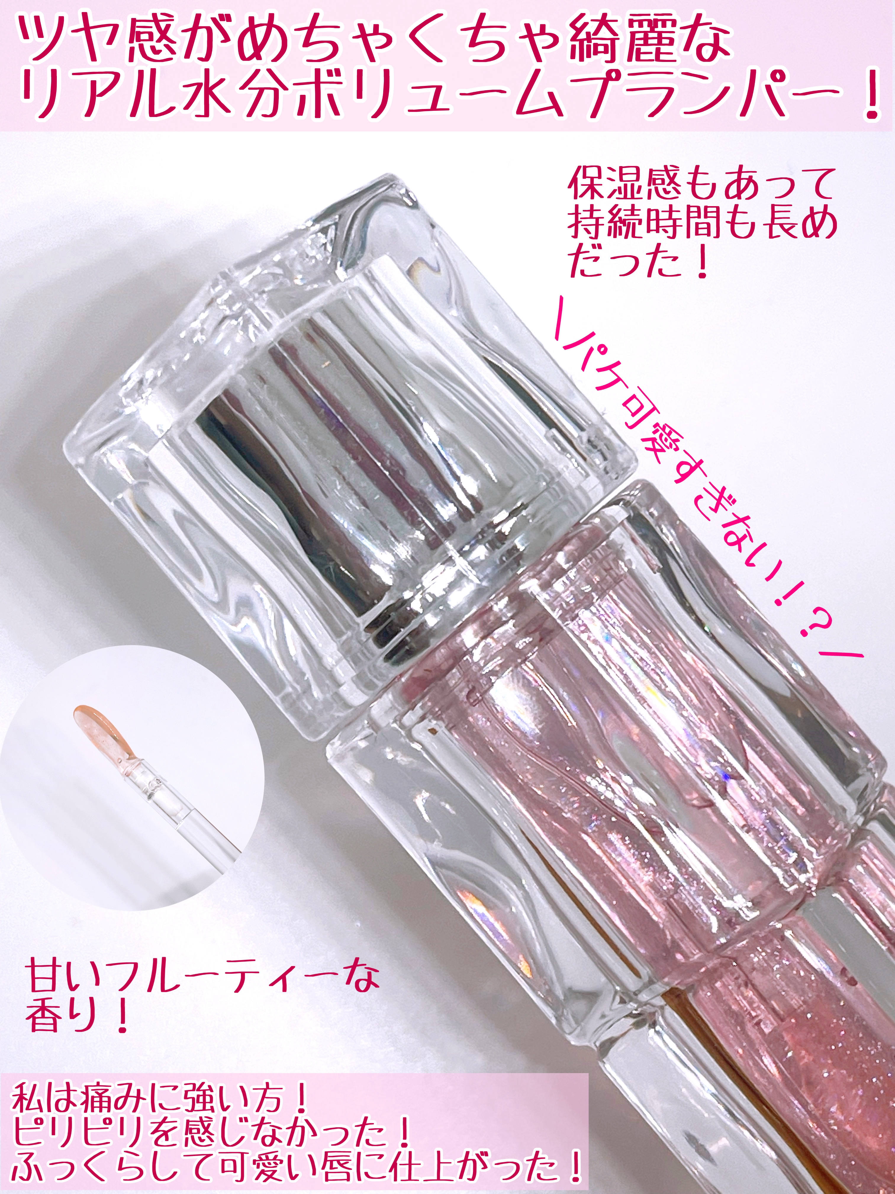 - うるおい満ち溢れるちゅるんとグロウティント! 角質層から水分と作用してボリューム感を演出するプランピング効果でふっくらと輝く唇に仕上げる*リッププランパー。 唇のツヤとボリューム感*を長時間持続させ、ほのかに広がるラメ&パールを配合し、長くキラキラと輝きます。 ◇Glossy Barrier System 水分の蒸発を防ぎ、早い変化を誘導する技術で、ガラスように澄んだ光沢のあるオイル膜が唇の上をキープし、自然な着色と色落ちの少ないツヤ感を演出します。 ◇ポイント ✓やさしい使用感のウォータースピキュール配合で、潤いを与えふっくらボリュームアップして見せる ✓あらゆる角度から輝き、ぷるぷるしっとりとしたボリューム*リッププランパー ✓唇の表面にグロッシーバリアを形成し、ふっくらとしたボリューム感* *メイクアップ効果による