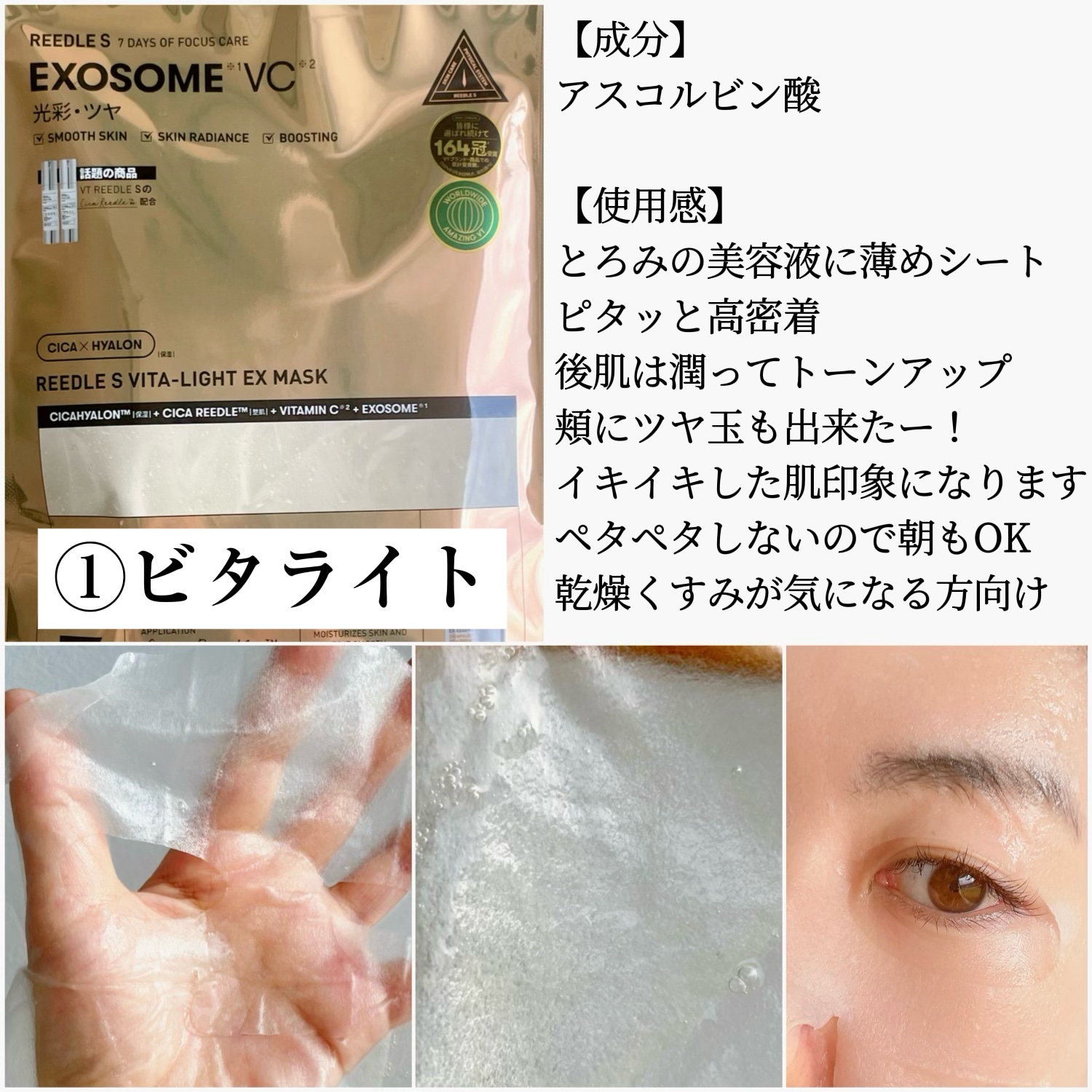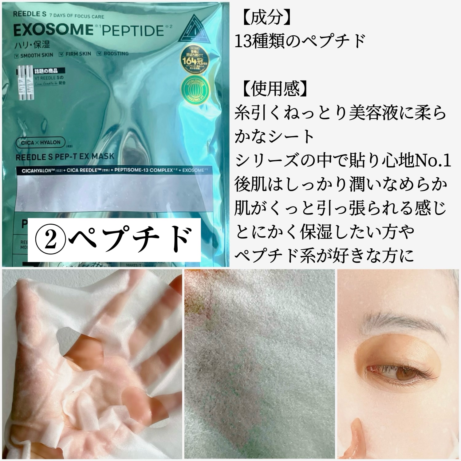 シカリードル配合とのことですが、どれもチクチクはせず。無香料で使いやすいです。 個人的にはビタライト推し✨ この価格帯でツヤとトーンアップ得られるのは嬉しい☺️ エイジングではペプチドとEGF両方良い💞 ペプチドのがパンっと張るような感じ、EGFはふんわり柔らかい肌と少し感触が違います。 EGF良いマスクだから目元と口元の空きだけ改善して欲しい🥹そしたら⭐︎5つつけたい‼️ レチAは真夏に毛穴がパカっと開いた時に良さそうです^_^