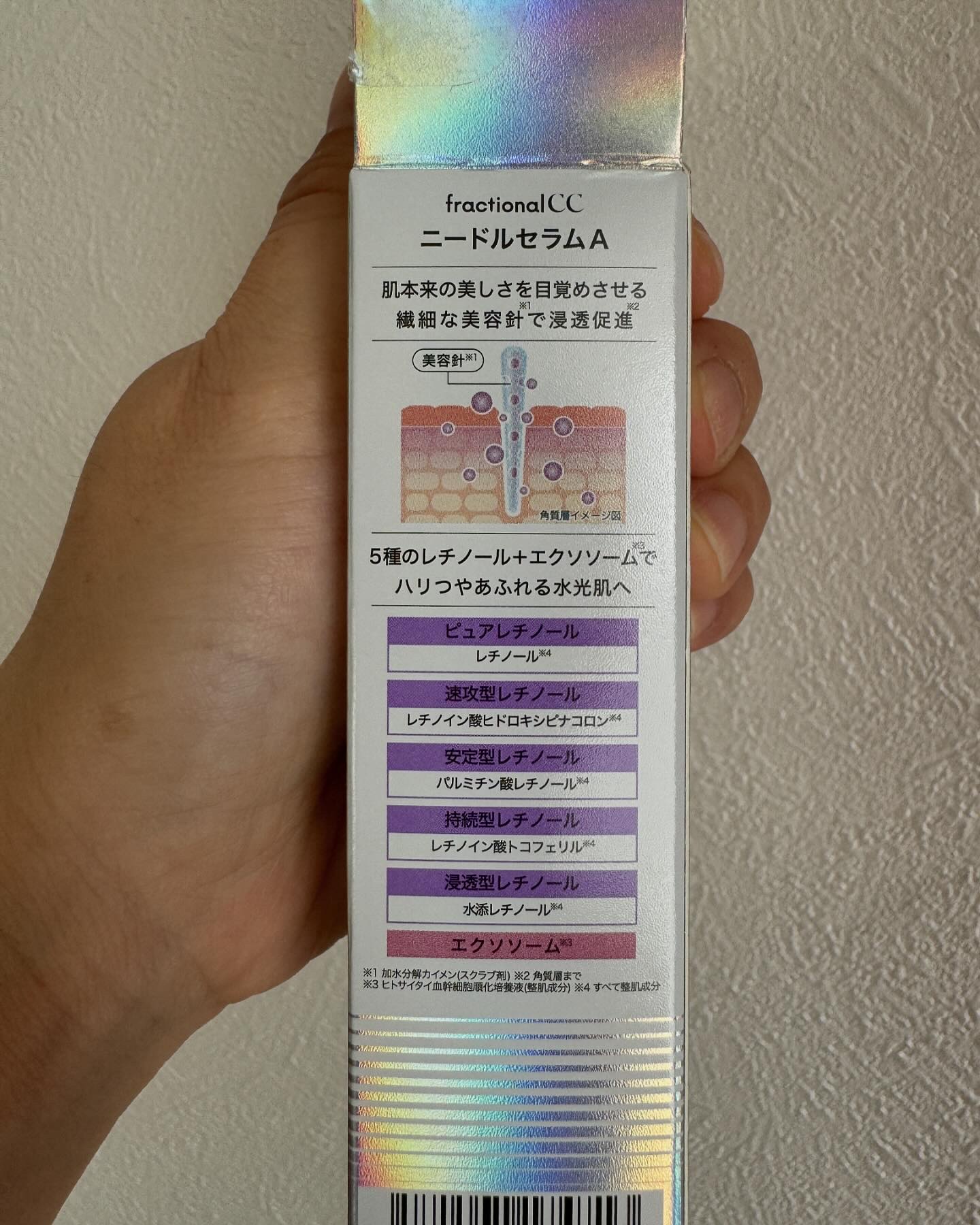 - 1:5種類のレチノールとエクソソーム※5配合で水光肌へ導く 5種のレチノールカクテル+エクソソーム※5と美容針※3を掛け合わせたfractional CCならではの処方で集中弾力ケア。肌のハリ・ツヤ・毛穴※8をケアし、翌朝きらめく「水光肌」へ。 2:マイルドな刺激感※1 本製品はマイルドな刺激感(チクチク感)※1が特徴ですが、美容針※3の配合量が少ないわけではありません。 純度99%の繊細な美容針※3を1商品(30mL)あたり約15万本配合(1mlあたり約5,000本配合)。美容針※3が美容液成分を纏った状態で角質層まで届き、肌本来の美しさを目覚めさせます。 また、保湿クリームの直前に塗るタイプのニードル美容液のため、後のスキンケアアイテムによる摩擦が少なく、沁みて痛くなることを避けやすい使用順番にしています。 「ニードル=痛そう」というイメージを持っている方や、ニードル美容液を使用したことがなく、試したいけど刺激感が気になるという方におすすめです。 3:日本製&お手頃価格 日本人の肌質を考えて日本で商品企画を行い、日本で製造したMade in JAPANのニードル美容液です。 レチノールやニードルなど、SNSでもよく見かける注目成分を試してみたいけど、肌に合わなかったらどうしよう、刺激が気になる…という方でも手に取りやすいよう、2,860円(税込)に価格を抑えました。 普段のスキンケアにニードル美容液を取り入れてみませんか? ※1 痛みの感じ方には個人差があります※3 加水分解カイメン(スクラブ剤)※5ヒトサイタイ血幹細胞順化培養液(整肌成分)※8 乾燥により目立つ毛穴 2024年5月31日 オンラインストア 2024年6月下旬 全国のロフトおよびロフトネットストアにて先行販売開始 2024年7月下旬 全国のバラエティストアにて順次販売を開始(いずれも一部店舗を除きます。)