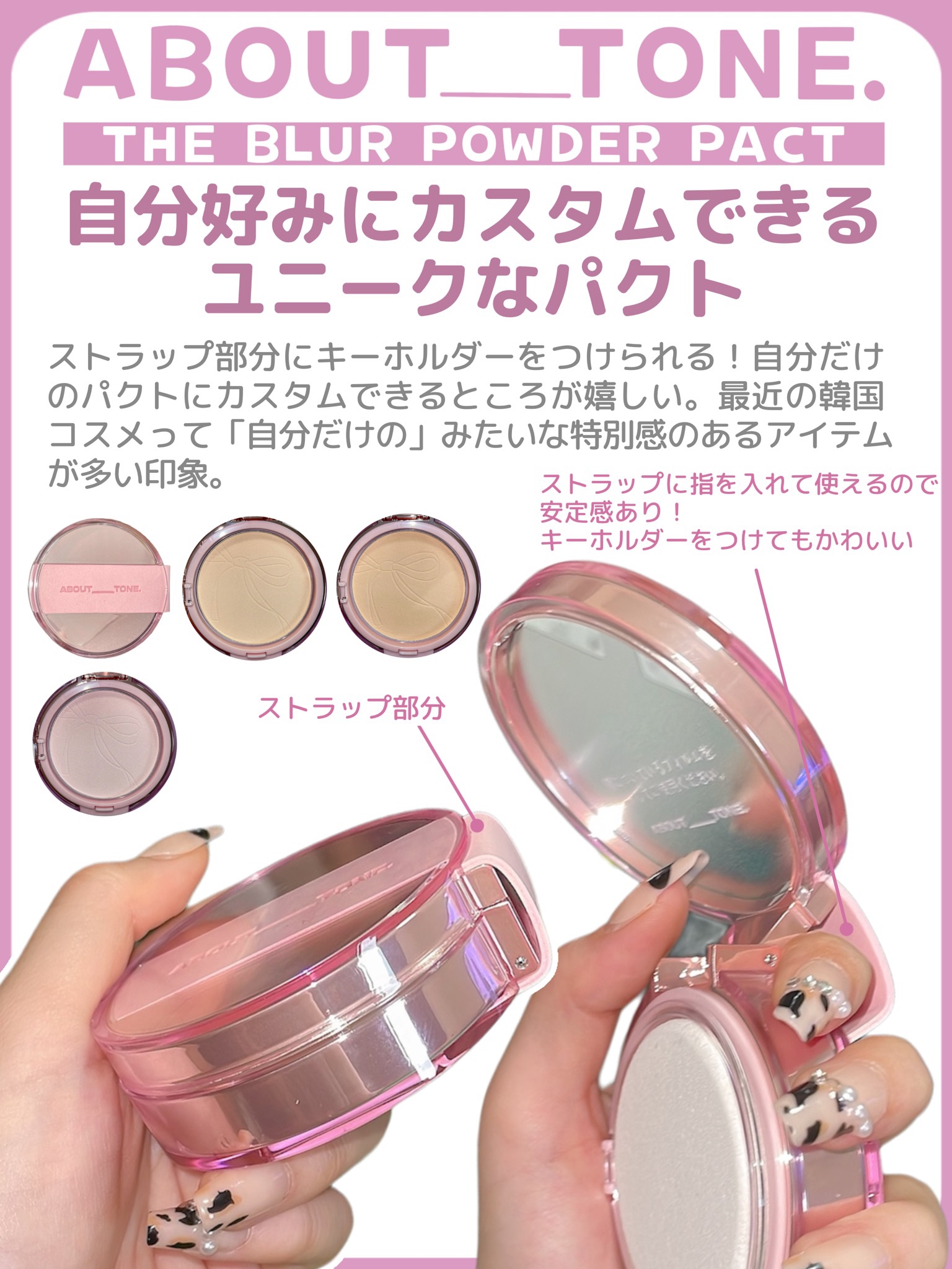 - ・ダイアモンドパール含有で、ほのかな輝きを演出 ・油分・皮脂ケアで、長時間さらっとした肌を維持 ・アバウトトーンだけのカスタムストラップデザイン