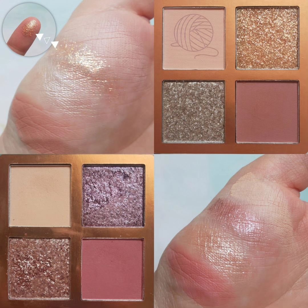 初めて見た時から頭から離れず 今年初コスメとしてお迎えしたイノセントブルーム。完全なる春満開なカラーでめちゃくちゃ可愛いです👏 全て発色もいい! 左上のカラーはピンク感強め。透け感のあるピンクのキラキラカラー。右上はしっかりピンク。発色が良いのでチークとしても良さそう!左下はしっかりめのオレンジ。ハッキリとオレンジに発色してくれる。右下はイエローのキラキラ。かなりキラッキラしていてアクセントにぴったり!