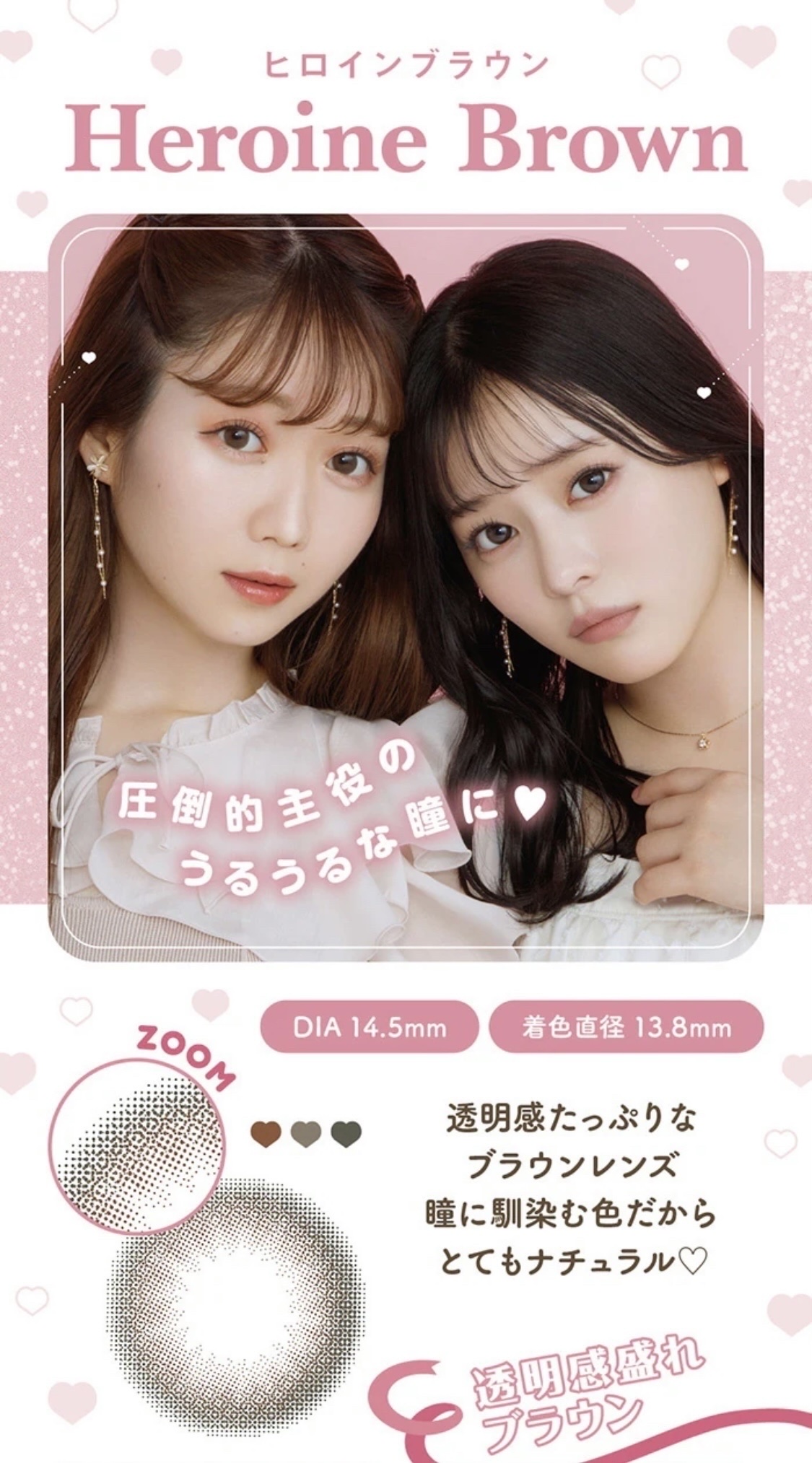 - ※2025年6月以降、商品パッケージ裏面・側面の一部表記を順次変更いたします。尚、これにかかる商品の交換・返品は承っておりません。 ヒロインの瞳の法則♡ ナチュラルなのにしっかり盛れるDIA14.5mm! ■ヒロインブラウン 透明感たっぷりなブラウンレンズ。瞳に馴染む色だからとってもナチュラル。 ■アイドルリング さりげない細フチとちゅるんブラウンがナチュラルに瞳を強調♡ ■ライアーピンク ピンクブラウンのフチとムラのあるデザインで立体感のあるきらきらな瞳を演出♡ ■レディブラック じゅわっとぼかした繊細なデザインで透明感に満ちた存在感のある瞳を演出♡ ■プリンセスショコラ しっかり太フチとあまくとろけるショコラブラウンでプリンセスみたいに愛される瞳に♡ ■スターグロー くりっと盛れる太フチとうるみツヤめく水光カラーで光を取りこむキラツヤな瞳に♡ ■Maria Ring(マリアリング) 絶妙細フチと白っぽ透明感グレージュでちょっぴり背伸びした余裕仕込みレンズ♡ ■Mermaid Ring(マーメイドリング) 絶妙太フチときらめき透明感マーメイドグレーでピュアにうるめく美少女な瞳に♡ カラーコンタクトレンズの不適正使用による眼障害の危険性等などがあります。 ●コンタクトレンズは高度管理医療機器です。不十分な洗浄・消毒など不適切なケアや、長時間・交換期間を超えた装用により、アレルギー性結膜炎、角膜感染症、角膜潰瘍等の重篤な眼障害が発生する危険性があります ●ご使用前に取扱説明書を確認してください 使用上の留意事項 ●眼科医院等を受診してからお求めください ●眼に異常を感じたら直ちにレンズ使用を中止し、お近くの眼科等で診察を受けてください ●医師の指示にしたがってご使用ください ●コンタクトレンズを装用する場合、自覚症状がなくても、眼科医院等での定期検査を受けてください ●レンズに不具合がある場合は使用しないでください