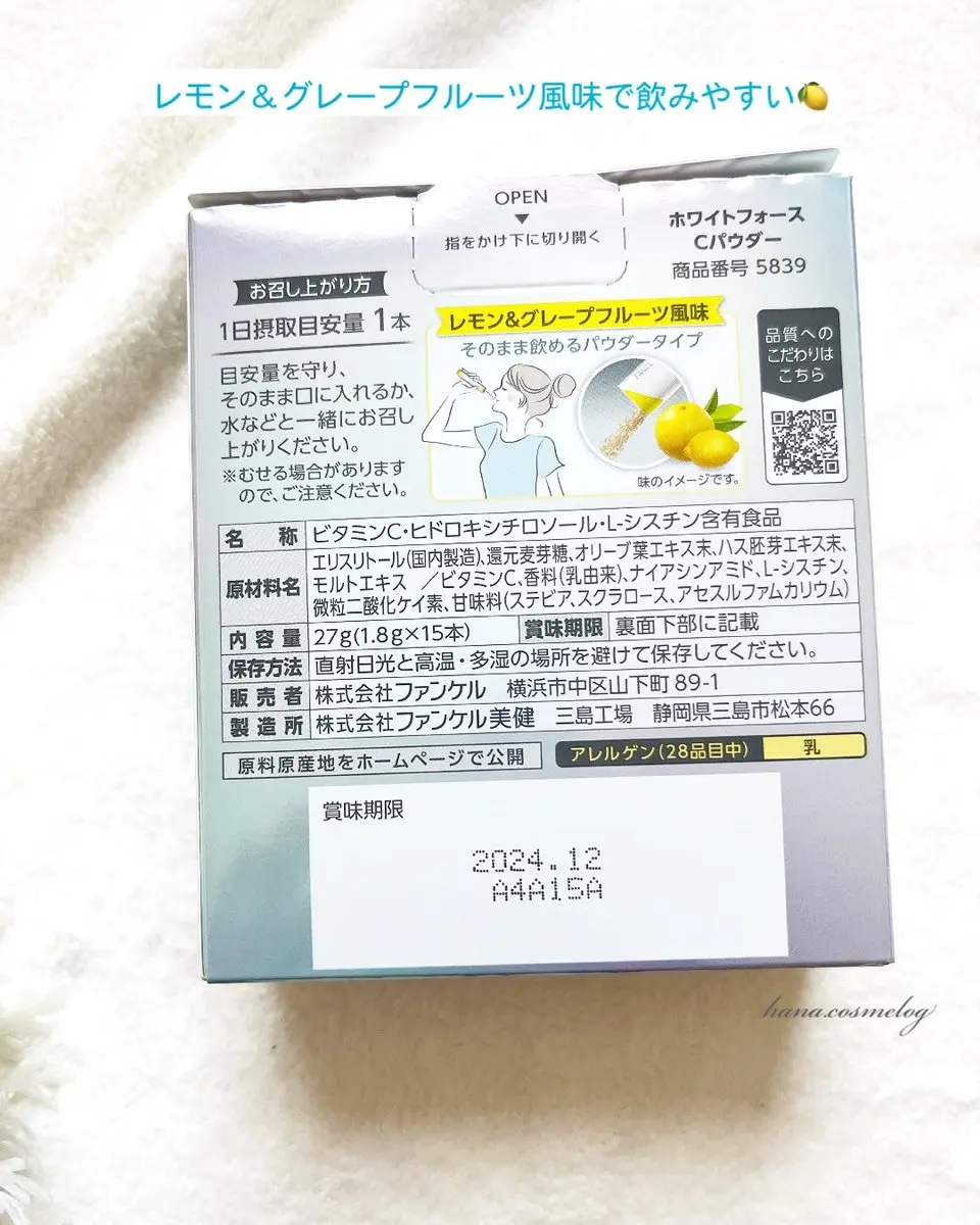 - 数量限定発売 ◆「トリプルビタミンC」を1,000mg配合 「トリプルビタミンC」は、体内に長く留まるビタミンC誘導体など、溶解性の異なる3種のビタミンCを配合しています。 汗などでビタミンCの失われやすい、夏の時期にも◎。 ほかにも「ヒドロキシチロソール」と「L-シスチン」「ハス胚芽エキス」を配合し、透明感のある美しい毎日をサポートします。 ◆爽やかなレモン&グレープフルーツ風味 水なしでそのまま飲めるパウダータイプのため、いつでもどこでも手軽にお召し上がりいただけます。 【1日の目安】 1本 【アレルゲン(28品目中)】 乳 【ご注意】 ※妊娠・授乳中の方、お子様はお召し上がりにならないでください。 ※2025年2月後半以降、商品パッケージリニューアル。