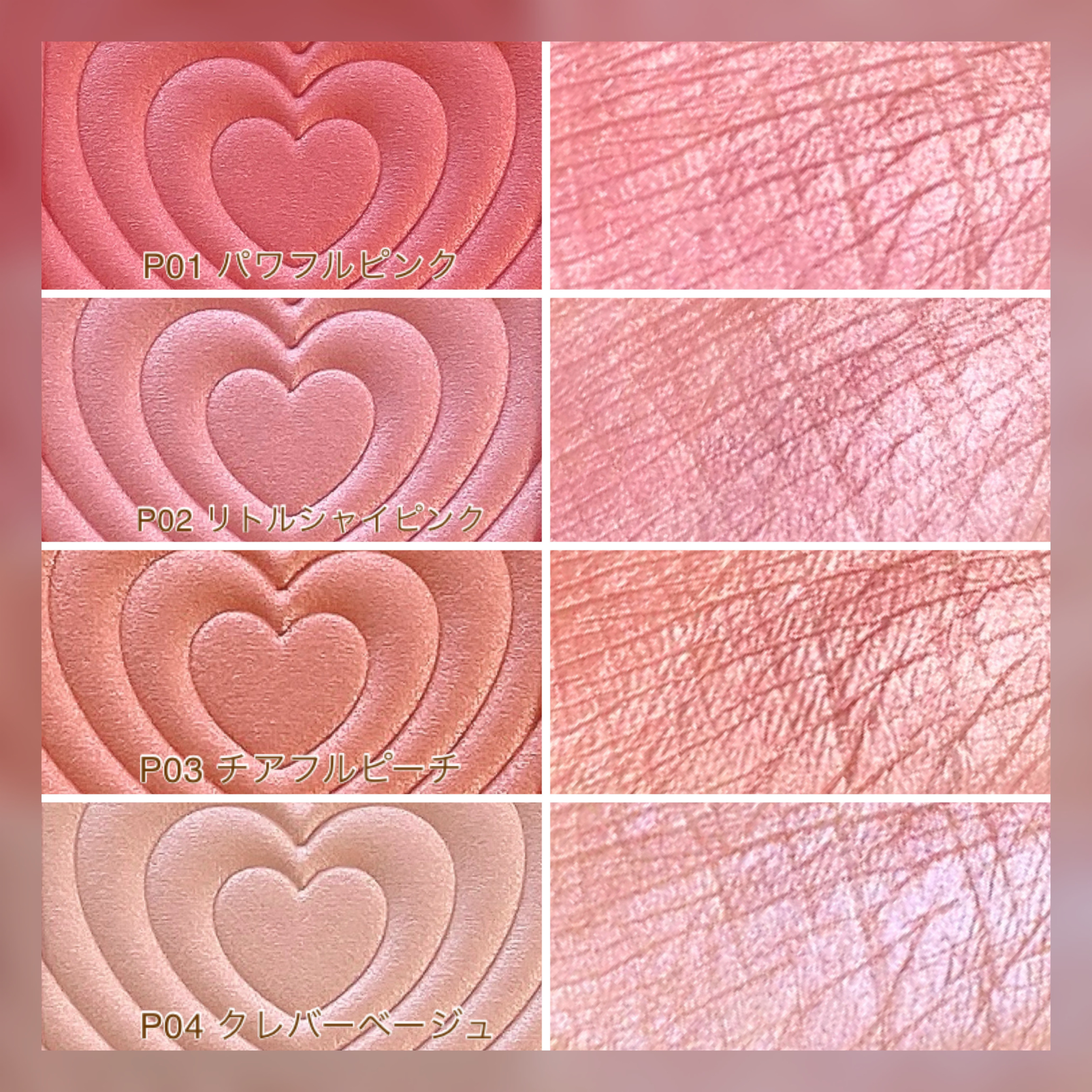 - 生まれ変わった、新・パウダーチークス! クリアな発色でしっとり溶け込むようなツヤ感単色チーク♡ 1.デザインがさらに可愛く♡ 使うたびにキュンとしちゃうハートデザイン♪ 2. 中身がもっと魅力的に ・しっとり感UP!※ ムラになりにくいクリアな発色 ・パール感がさらに繊細に!※ 溶け込むような自然なツヤ感です♪ 3. ブラシの毛量UP※ 広範囲に広げやすいふんわりブラシに進化! ※当社従来品比