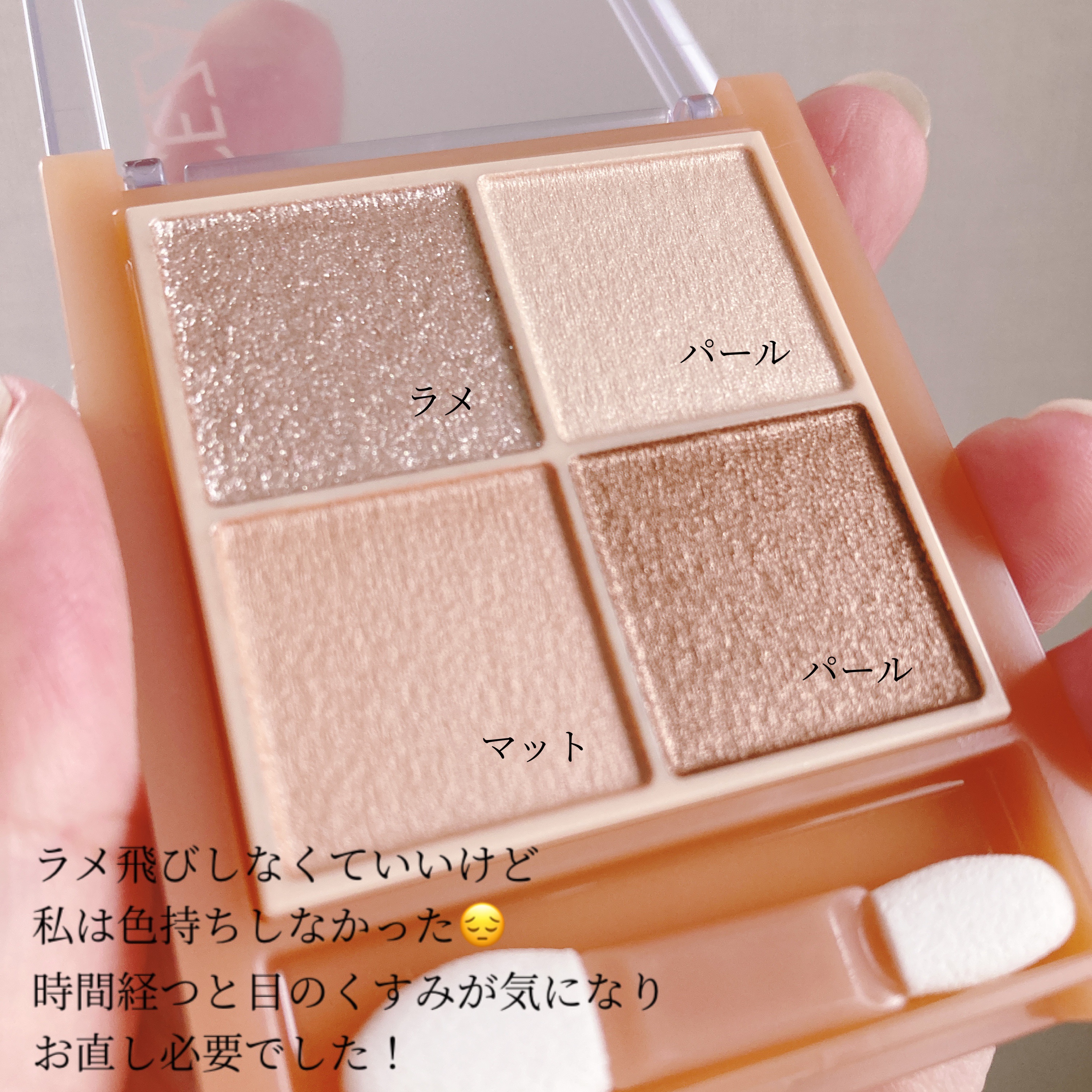 - ラメ・パール・マット3質感の4色アイシャドウ。 肌馴染みの良いベージュを基調としたカラー。ラメ・パール・マットの3質感を重ねて、自然にまぶたを強調し奥行のある大きな目元へ。 しっとり溶け込むような柔らかなパウダーなので、スルスル伸びてまぶたにピタッと密着。保湿成分(スクワラン・ホホバ種子油)配合。