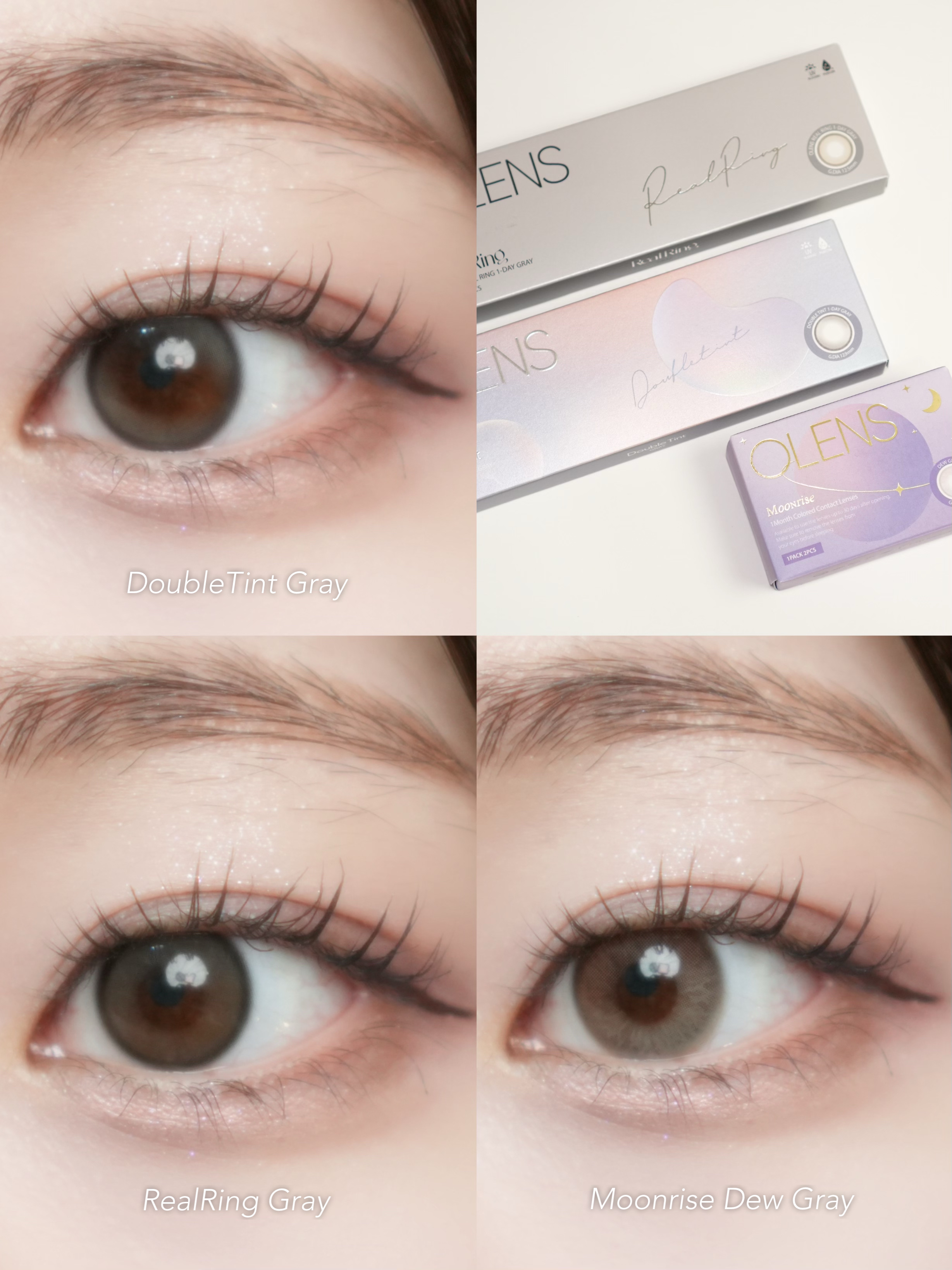 一番フチが太めだけど、ふわっとしたデザインなので きつい印象にならない! グレーみはしっかり感じることができる🩶 フチが細くてくっきりしてる! ガラス玉みたいにくりっとした印象に✨ 瞳の印象をはっきりさせたい人におすすめ 着色直径は一番小さめだけどくりっと見える! 比較すると、ベージュも混ざったような色に見えて グレージュカラーに近いイメージ♡