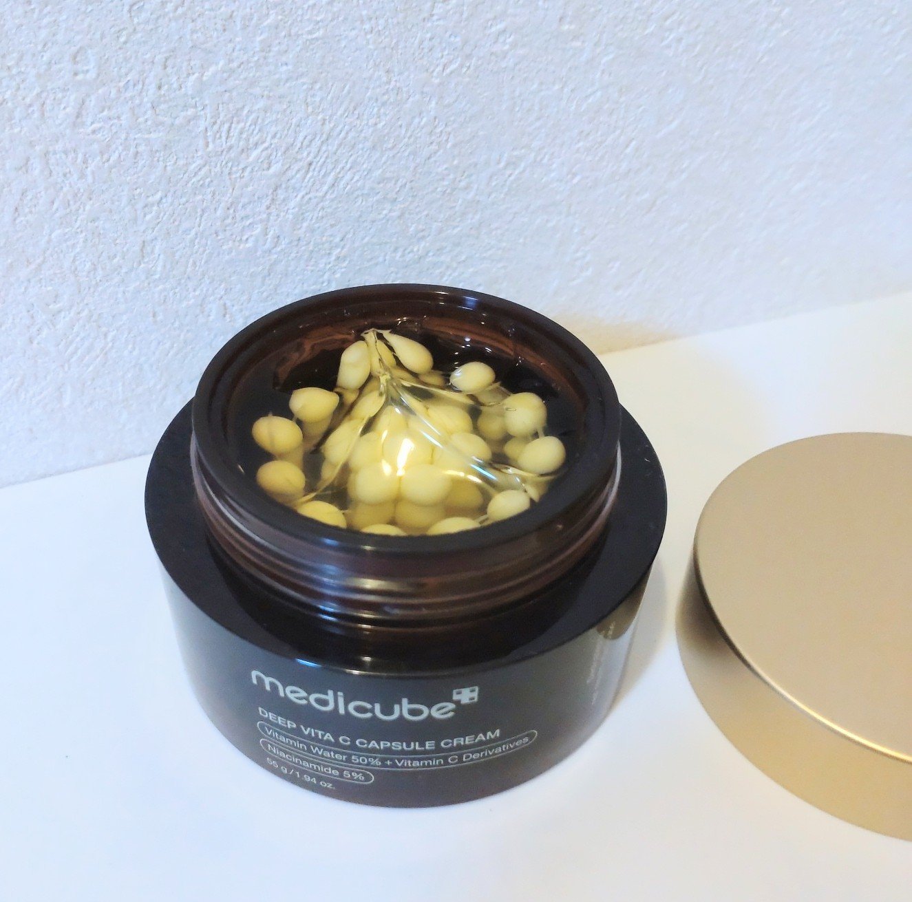 メディキューブのディープビタCカプセルクリームを買ってみたよ!顔にカプセルをたくさんのせている人を見て、私も試したくなって購入😍ビタミンC誘導体5種、ナイアシンアミド、ピュアビタミンC、ビタミンツリーウォーターが配合✨仕上がり透明🫥ジェルを多...