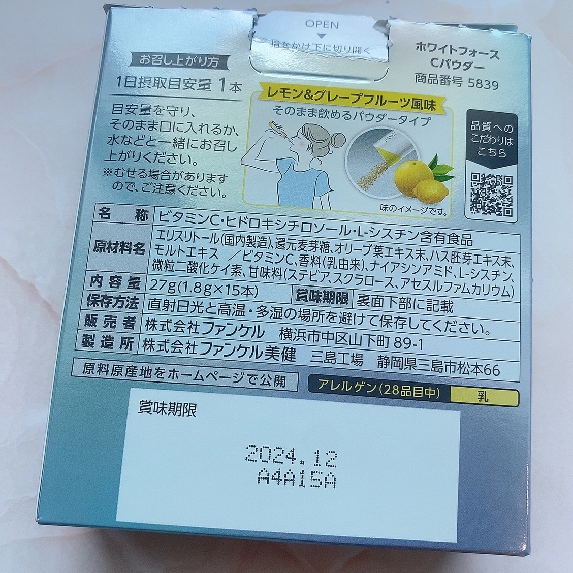 - 数量限定発売 ◆「トリプルビタミンC」を1,000mg配合 「トリプルビタミンC」は、体内に長く留まるビタミンC誘導体など、溶解性の異なる3種のビタミンCを配合しています。 汗などでビタミンCの失われやすい、夏の時期にも◎。 ほかにも「ヒドロキシチロソール」と「L-シスチン」「ハス胚芽エキス」を配合し、透明感のある美しい毎日をサポートします。 ◆爽やかなレモン&グレープフルーツ風味 水なしでそのまま飲めるパウダータイプのため、いつでもどこでも手軽にお召し上がりいただけます。 【1日の目安】 1本 【アレルゲン(28品目中)】 乳 【ご注意】 ※妊娠・授乳中の方、お子様はお召し上がりにならないでください。 ※2025年2月後半以降、商品パッケージリニューアル。