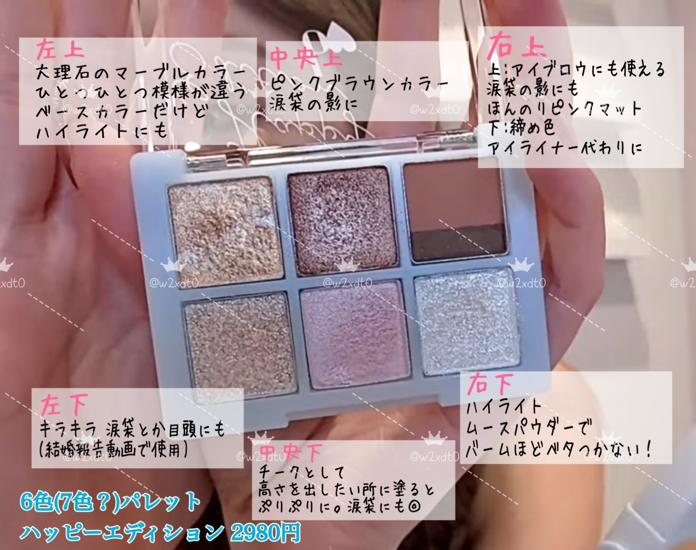 あかりんの欲しいを詰め込んだ限定6色パレット♡ アイメイクはもちろん、頬や眉にも、華やかにときめくマルチパレット。 “特別な日に使ってほしい”とのあかりんの思いが込められたパレット。カラー的に派手なカラーを使っている訳じゃないけれど盛れる✨️ さすがあかりんです🩷 あかりん自身の結婚という事もあり、ブルーのパケも可愛い🩵