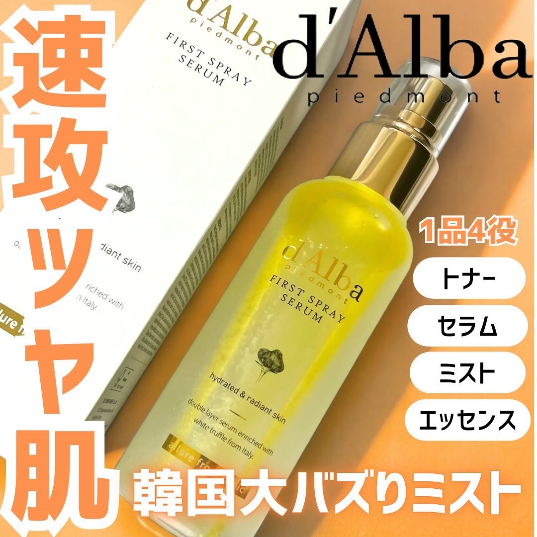 - イタリア産ホワイトトリュフ*と植物性オイルで豊かな水分を与えツヤ肌に仕上げる保湿ケアミストです。肌表面の保湿だけでなく、内側までしっかり二重で保湿可能。さらにダルバ独自のトリュフェロールTMが肌に弾力を与えます。霧のような細かなミストで洗顔後やお風呂上り以外のメイクの上からでもメイクを邪魔することなく使用することができます。 *ツベルマグナツムエキス(保湿成分) イタリアヴィーガン認証V-LABEL取得 皮膚低刺激テスト済み *全ての方に皮膚刺激が発生しないということではありません。 【ご使用方法】 1. 洗顔後、3~5回振って中身が十分に混ざった後、顔全体にまんべんなく噴射して軽くたたいて肌に馴染ませます。 * 鼻や口から吸い込まないように注意してください。 【使用上の注意】 お肌に異常が生じていないかよく注意して使用してください。化粧品がお肌に合わないとき即ち次のような場合には、使用を中止してください。そのまま使用を続けますと、症状を悪化させることがありますので、皮ふ科専門医等にご相談されることをおすすめします。 (1)使用中、赤味、はれ、かゆみ、刺激、色抜け(白斑等)や黒ずみ等の異常があらわれた場合 (2)使用したお肌に、直射日光があたって(1)のような異常があらわれた場合