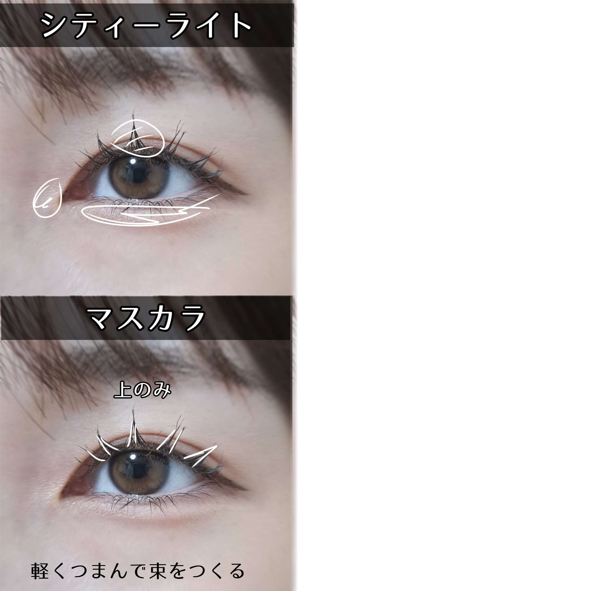 オレンジ系のライトで撮ったので顔面オレンジっぽくなってます。加工で鏡で見る色に近づけましたがオレンジっぽいです…。 ベースとして目元全体に塗る。 (これをすることによってシルキースフレアイズが薄くなる) 右上の薄い茶色を目元全体に塗る。 左下の濃い茶色を目尻に塗る。 ラメを涙袋とアイホールの中央、目頭に塗る。 つり目のアイラインとオーバーラインを描く。 3角ゾーンにほんの少しだけ塗る。 (塗りすぎると目立つので注意) 涙袋の影を描く。二重強調するために二重をなぞる。 まつ毛をしっかりあげてからたっぷり塗り、爪でつまみ指で整えながら軽く束を作る。 まつ毛に塗ってのばす。