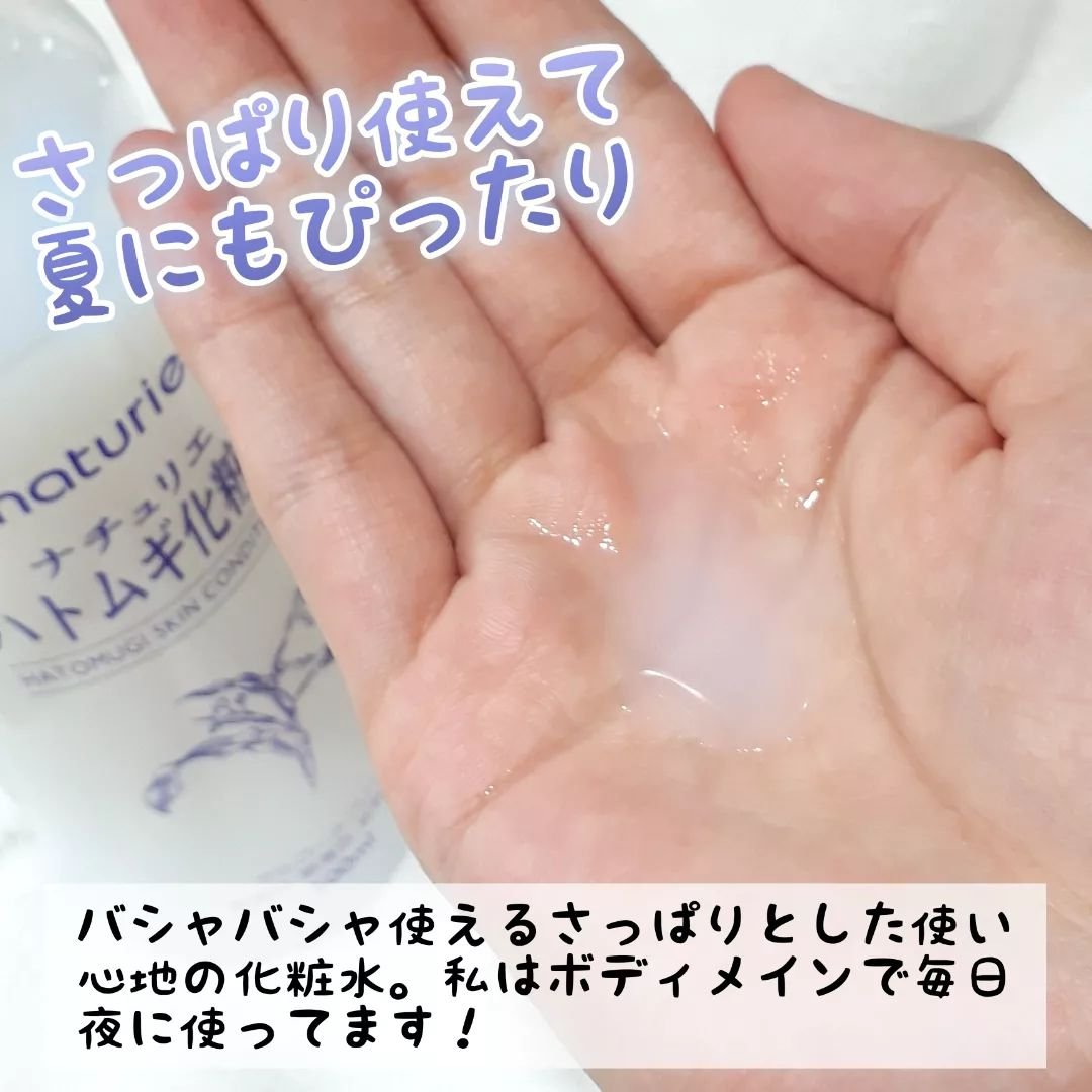 - 肌にうるおいを与えてスキンコンディションを整える、天然保湿成分ハトムギエキス配合の化粧水です。 みずみずしく浸透力に優れた処方なので、重ねるほどぐんぐん肌になじみ、角質層を水分で満たします。 たっぷり肌に重ねづけしてもべたつかないさっぱりした使用感なので、スキンケアのはじめにたっぷり使ってください。 肌がひんやりしてきたら十分に水分がなじんだサインです。 ■基本は化粧水として スキンケアのはじめにたっぷり使ってください。 500円玉大の量を3回重ねづけするのが目安です。 肌がひんやりしてきたら十分に水分がなじんだサインです。 ■ローションパックでさらにうるおい コットンやフェイスマスクにたっぷり含ませて約3分間パックすると、角質水分量がさらに高まります。 ■プレ化粧水として 洗顔後すぐにつけることで、その後につけるスキンケアのなじみをよくします。※角質層まで ■ボディにも べたつかないので、毎日の入浴後や日差しを浴びた後などのボディのスキンケアにもおすすめです。