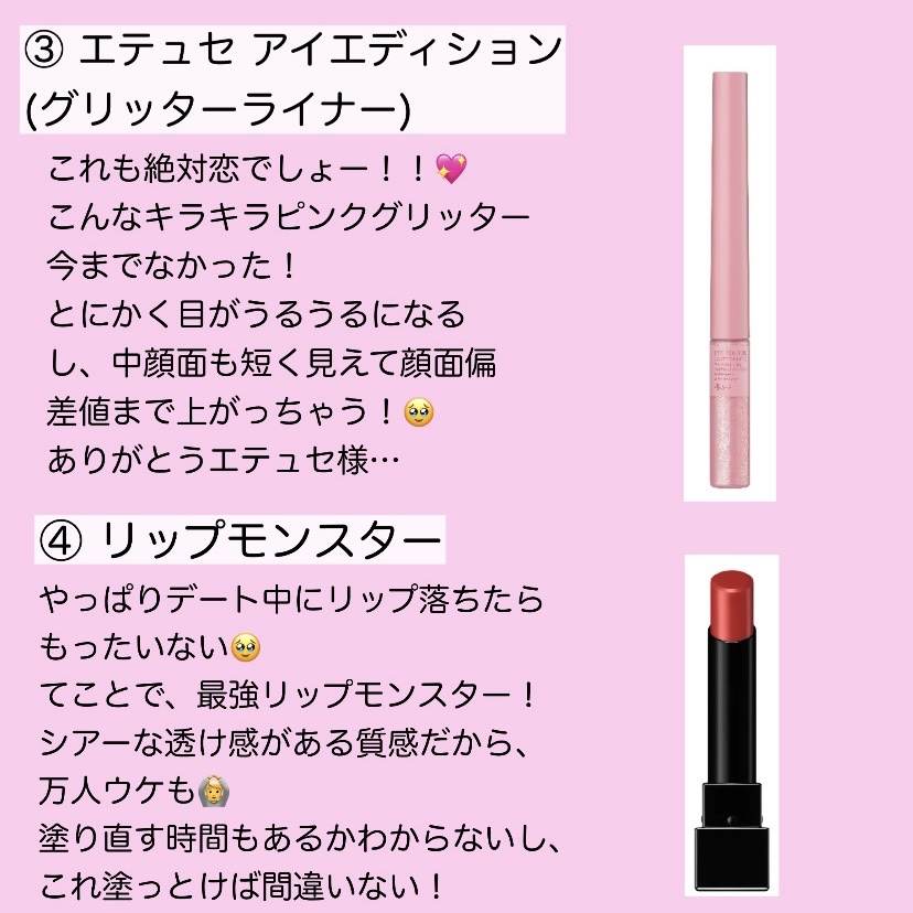 右上のピンクは時短したい時などに大活躍で、アイシャドウやチークにも使えますよ🩷 質感が綺麗だから、時短メイクに見えなくてお気に入りのカラーです! 001番も持ってるけど、やっぱりこっちの方が使用頻度高い😂 それくらいお気に入りコスメです🫶🏻