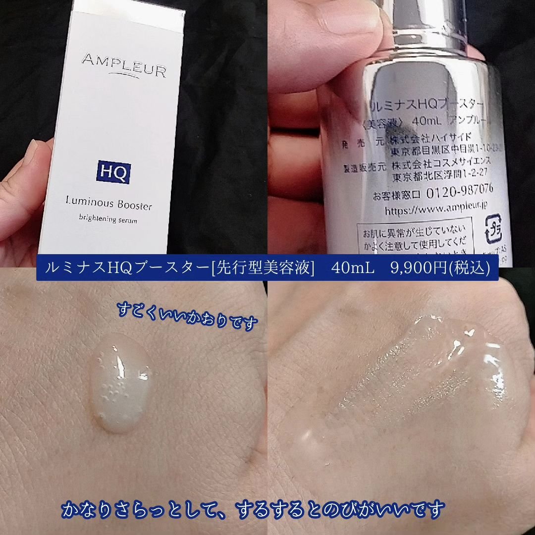 *アンプルールルミナスHQブースター気になるしつこいくすみの元を断つ先行型美容液(導入美容液)洗顔後に3プッシュを手に取り顔全体に馴染ませて使用していますとろみのあるテクスチャーですが伸びが良く肌馴染みがとても良く次のプロセスのスキンケアが...