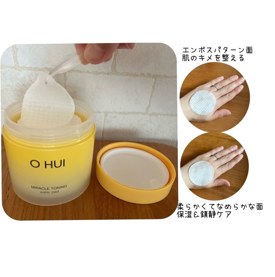 OHUIの人気ライン"ミラクルトーニング"のトナーパッド💛 エンボスパターン面は、柔らかく吸い取って肌のキメをなめらかに整えてくれるそう📝 みずみずしく爽やかな使い心地💎 ベタつきもないので、朝のメイク前の使用にもおすすめ🌸