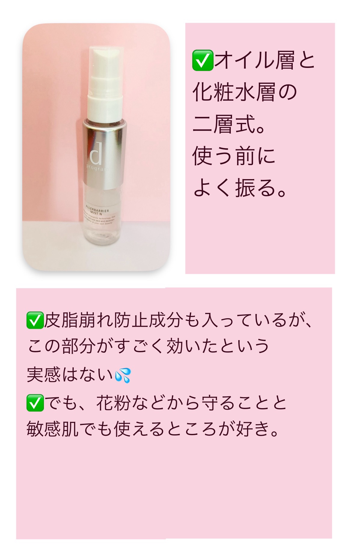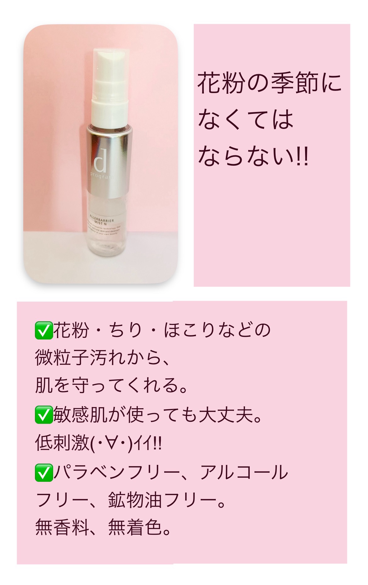 dプログラムアレルバリアミスト¥1,650・花粉・ちり・ほこりなどの微粒子汚れや乾燥から肌あれしやすいデリケートな肌を守り、美肌を育む敏感肌用ミスト状化粧水です。肌を守るオイル層とうるおいを与える化粧水層が混ざり合う2層タイプで、瞬時にみずみ...