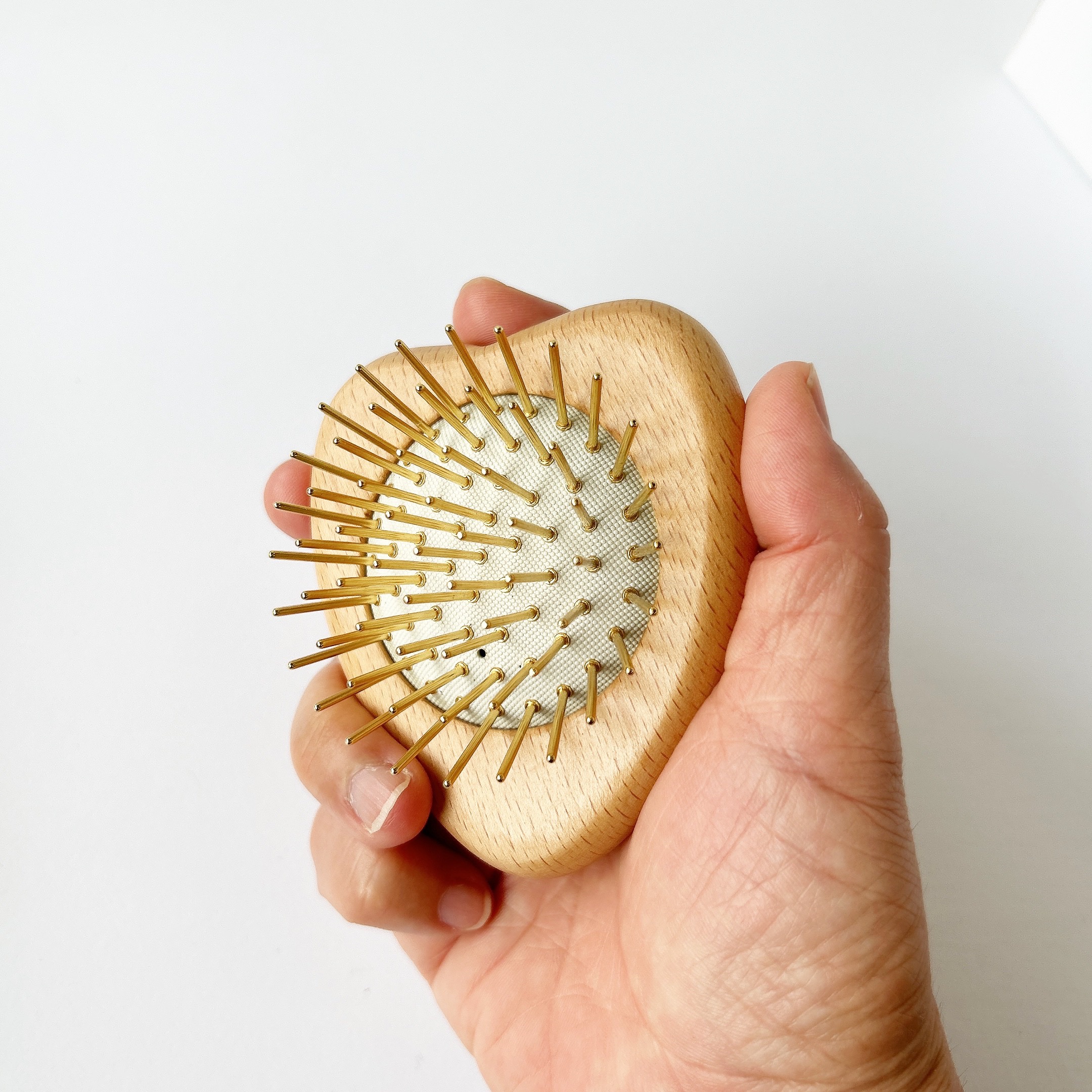 - 土台に美しく輝く61本のゴールドコーティングのピンが頭皮のツボをしっかり刺激し、ヘアや頭皮だけでなく、使う人の心もラグジュアリーな世界へ導き、同時に健やかな頭皮環境をサポート。頭皮を刺激して髪のボリューム感をサポートし、ブラッシングによりストレスで硬くなった頭皮もほぐします。頭皮や髪をケアするだけでなく、首や肩までマッサージでき、肩‧顔‧頭皮全体をリフレッシュすることで顔の表情も明るくなるようなこだわりのヘアブラシです。