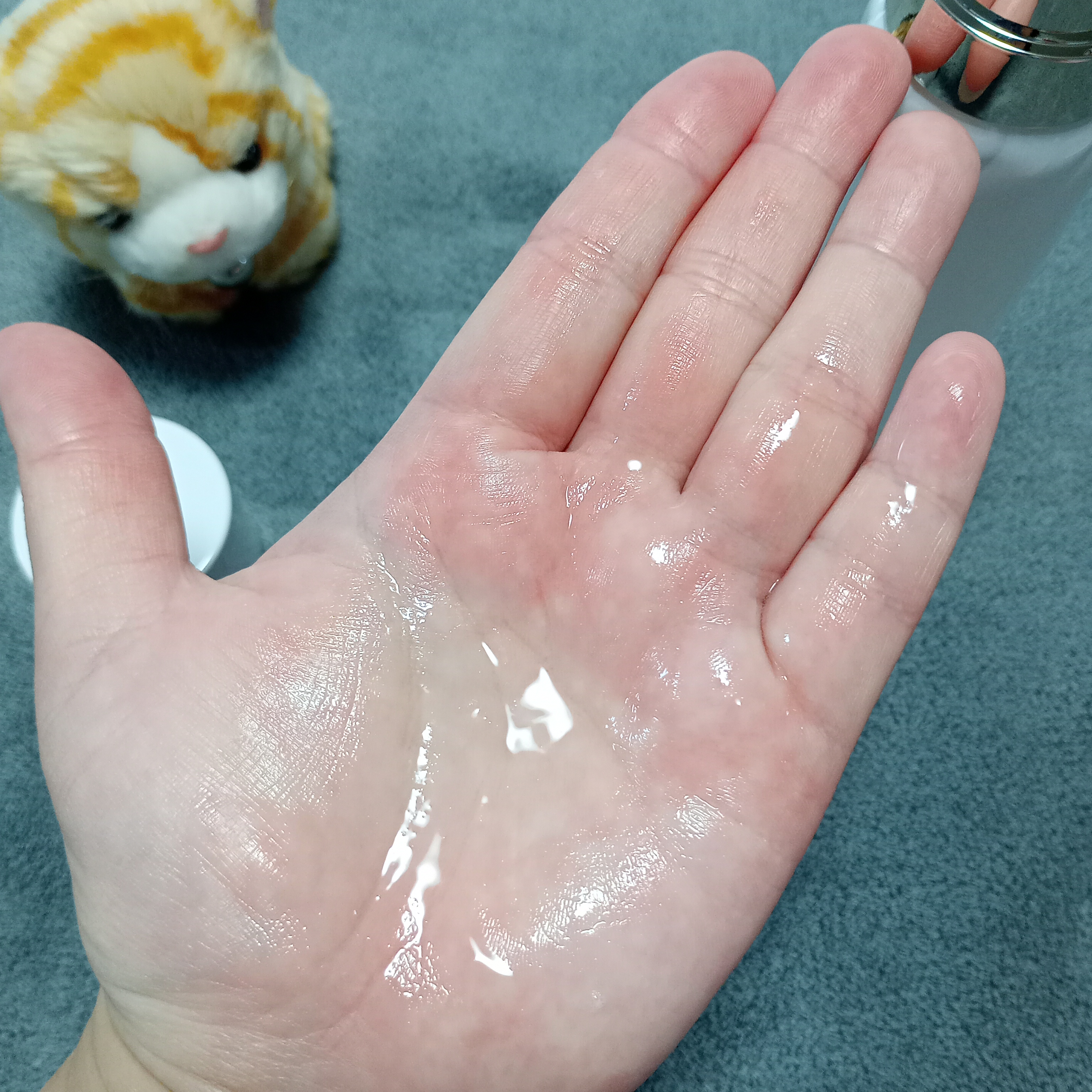 透明のジェルで固めのテクスチャー。かなり粘度の高いことが写真から分かるでしょうか?ハチミツとか水あめくらい濃厚です!! お肌に付けると温かさも感じます。 伸びは良くないですが使いにくいと思った場合は導入ローションを使うと良いです