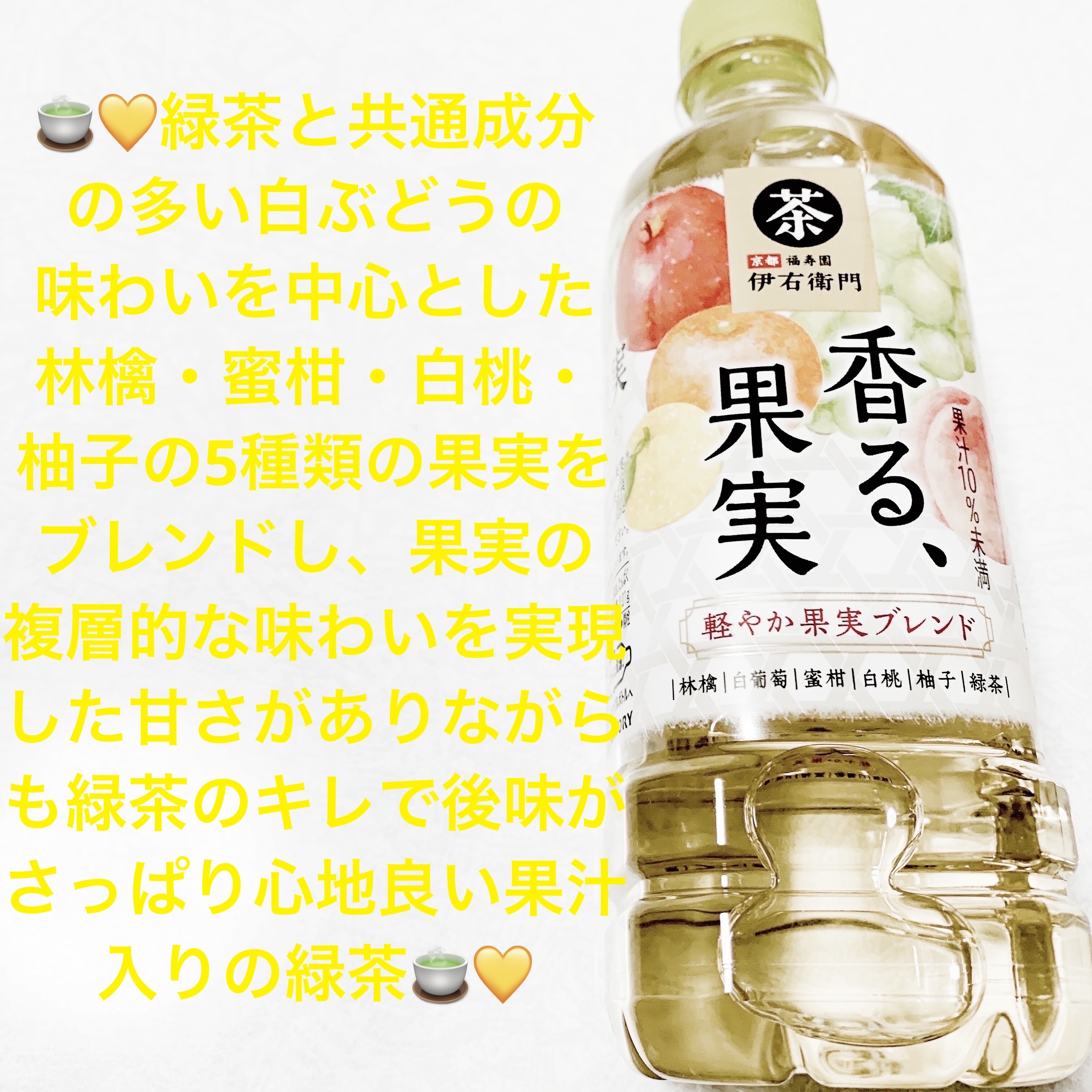 サントリヌ 䌊右衛門🍵💛 銙る、果実🍵💛 軜やか果実ブレンド🍵💛内容量:525mL 皎抜き100円 果汁飲料カテゎリヌの䌞長ず、倧人も気軜に果汁飲料を飲みたいずいうニヌズがある事に着県し、䌊右衛門ブランドだからこそ生み出せるこだわりや䞊質さ、緑茶の埌キレを掻甚したすっきり爜やかな甘さを愉しめる新・果実飲料「銙る、果実」を開発したそうです💛🍵 䞭味の特長は、フヌドペアリング味わいや銙りが盞性の良い食材同士の組み合わせを考える事の考え方のもず、緑茶ず共通成分の倚い癜ぶどうを味わいの䞭心ずした五皮の果実林檎、癜葡萄、蜜柑、癜桃、柚子をブレンドし、果実の耇局的な味わいを実珟したそうです💛🍵 たた、果実に合う爜やかな銙りの倚い緑茶を厳遞する事で、果実の芳醇な味わいず甘さがありながらも、緑茶のキレで埌味がさっぱり心地良く、倧人でも気軜にお愉しみいただける味わいに仕䞊げおいるそうです💛🍵 朝食や軜食のシヌンに、サンドむッチずの食べ合わせがおすすめだそうです💛🍵 京郜犏寿園の茶匠が五皮の果実ず緑茶をブレンドしたそうです💛🍵 果実の芳醇で耇局的な味わいにより満足感がありながら、緑茶のキレによるさっぱり心地良い埌味が特長の倧人が愉しめる新しい果実飲料だそうです💛🍵 五皮の果実ず緑茶が絶劙に合わさった満足感がありながらも、埌キレ良く飲める倧人向けの味わいだそうです💛🍵 原材料は、砂糖囜内補造、果汁りんご、ぶどう、うんしゅうみかん、もも、緑茶囜産、柚子ピヌル酞味料、銙料、ビタミン、カラメル色玠だそうです💛🍵 果汁入りの緑茶は少し珍しいですが、意倖ずよく合い、矎味しいです💛🍵 五皮の果実のシズルを前面に描く事で、芳醇で耇局的な果実の味わいを衚珟したそうです💛🍵 たた、瞊曞きの「銙る、果実」ずいうネヌミングず、和柄の背景デザむンで、䌊右衛門ブランドならではの和の萜ち着いた印象を䌝えおいるそうです💛🍵 おすすめです💛🍵 #サントリヌ #䌊右衛門 銙る、果実 #䌊右衛門 #果実 #ダむ゚ット #飲み物 #ドリンク #お茶 #緑茶 #パケ買い #果汁 #スッキリ #癜ぶどう #りんご #みかん #癜桃 #ゆず #柚子 #