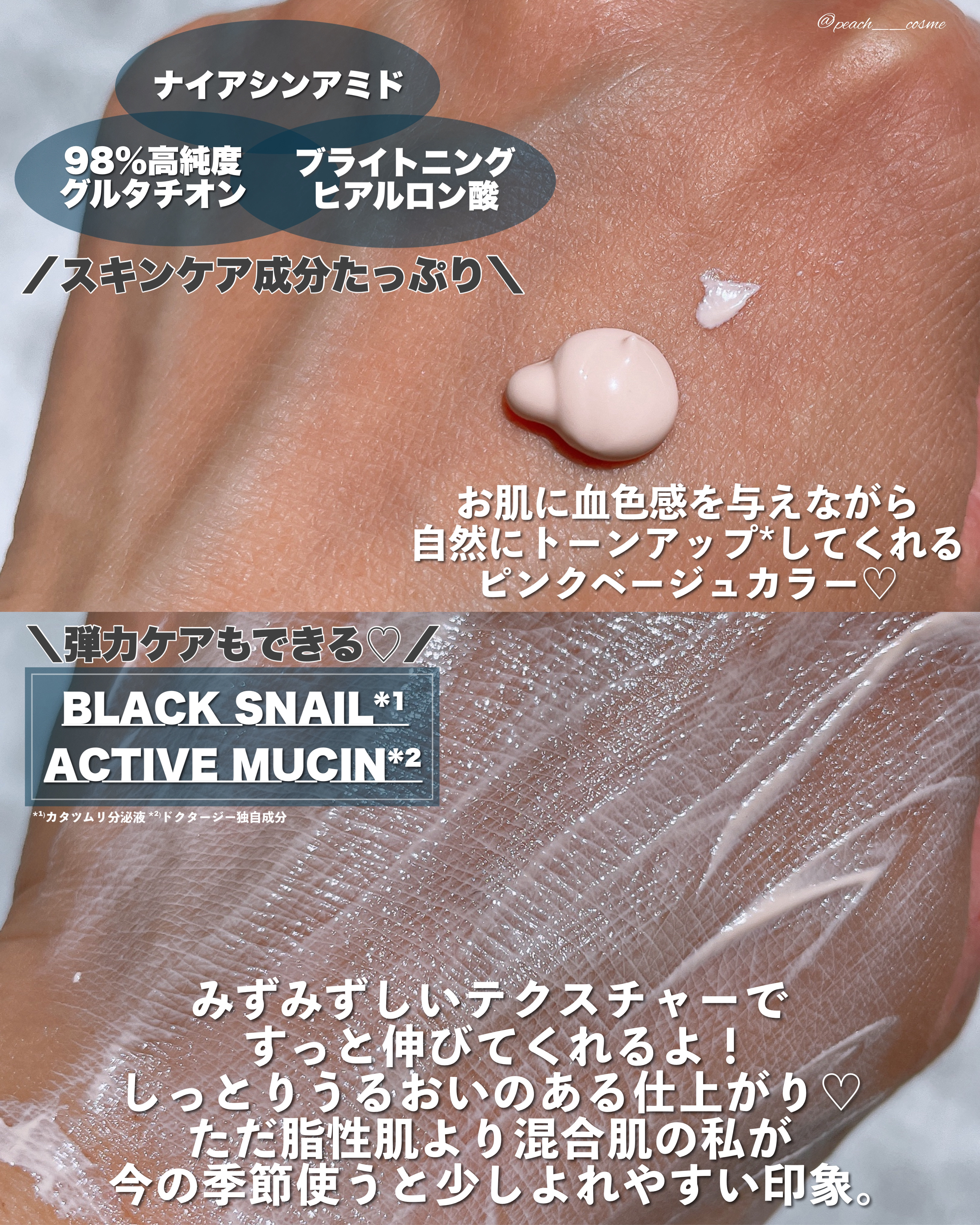 ブラックスネイルライン🐌✨ 体内の栄養分だけで最大6ヶ月冬眠しつつ生きのびることができる黒カタツムリ成分を配合♪ この日焼け止めは塗りやすい♪ すごくトーンアップするわけじゃなくて自然に肌補正して肌を明るく見せてくれる感じがする🥰 柔らかいテクスチャーで保湿クリームを塗っている感じで使えます✨
