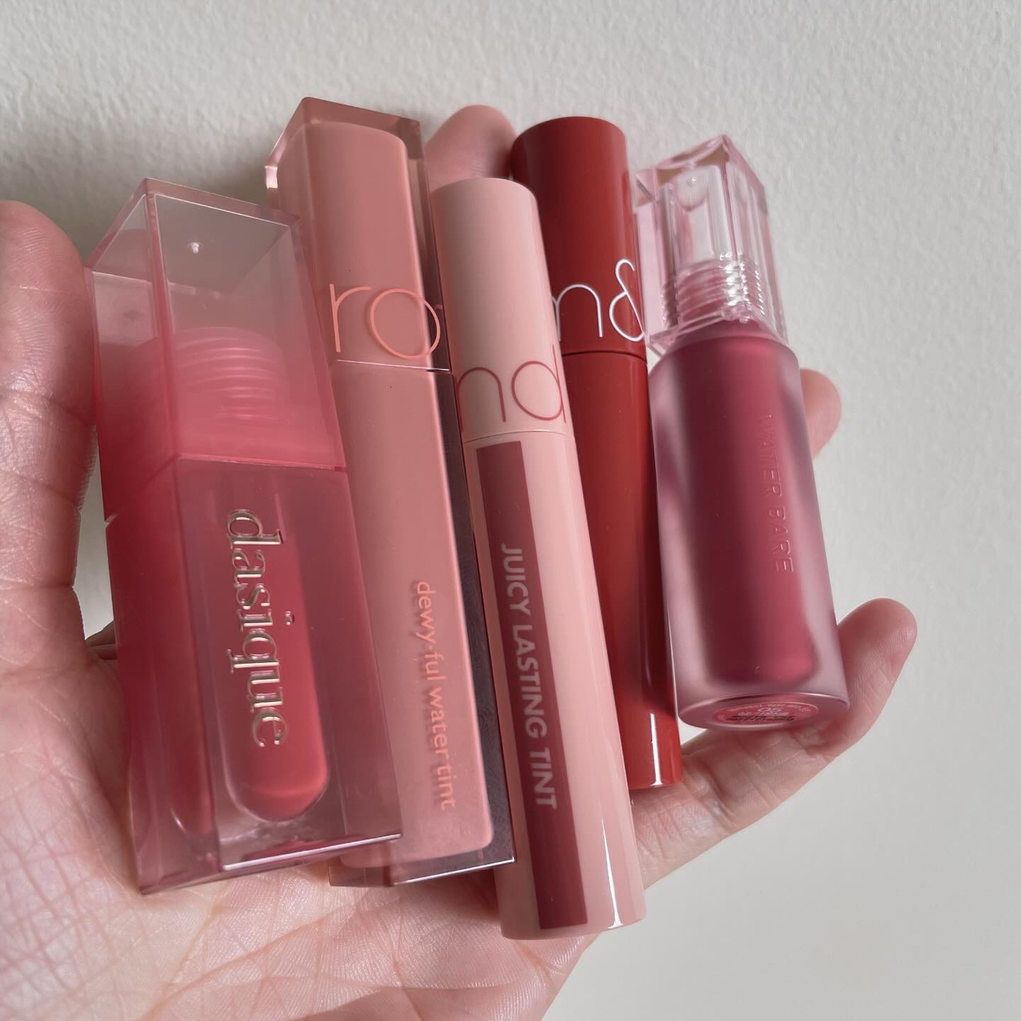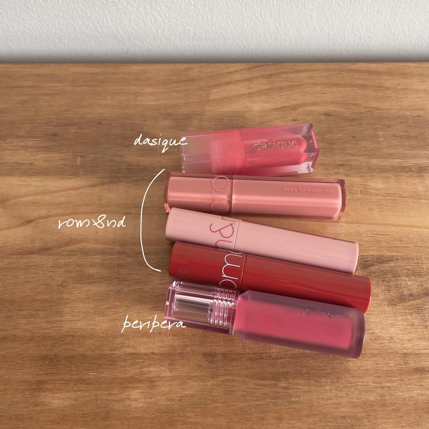 ピンクヌードで馴染みやすくて使いやすいよ🤍 どれもティントだから落ちにくくて◎ 1.dasique Juicy dewy tint (20 bare nude) 2.rom&nd dewy-ful water tint (12 canyon)