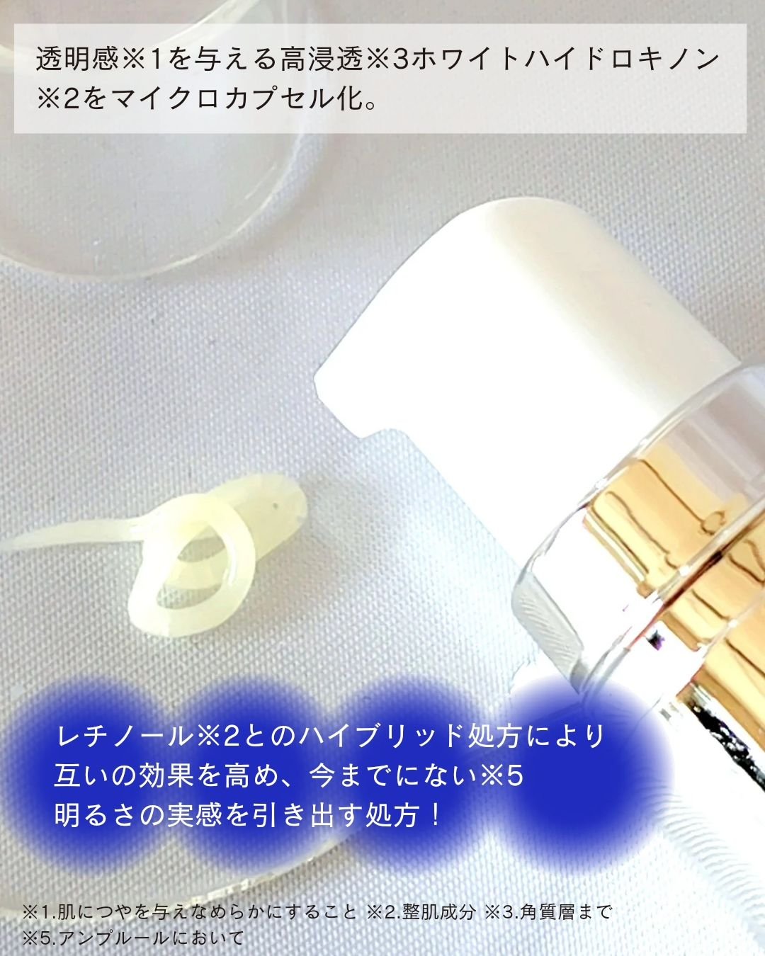 - ハイドロキノン※1最高濃度※2配合・アンプルール史上最高のブライトニング※3力を誇るスポット集中美容液。まるで“塗るハイドロキノン※1パッチ”のように密着し、睡眠中に明るさをチャージ。均一な肌トーンに導くレチノール※1とのハイブリッド処方による相乗効果で、今までにない※4曇りのない澄んだ透明感※5を引き出します。 ※1整肌成分※2アンプルールにおいてのハイドロキノン*配合率(*整肌成分)※3うるおいを与えて、明るい肌印象に導くこと※4アンプルールにおいて※5肌につやを与えなめらかにすること