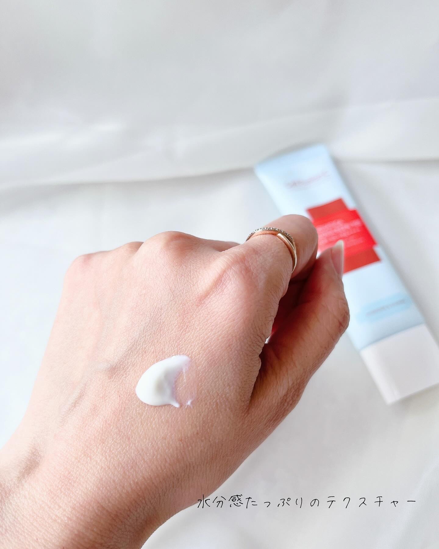 - 水分エッセンスのようにスキンケア感覚で使える日焼け止め。水分感たっぷりですが、さっぱりとした軽い付け心地がポイント。