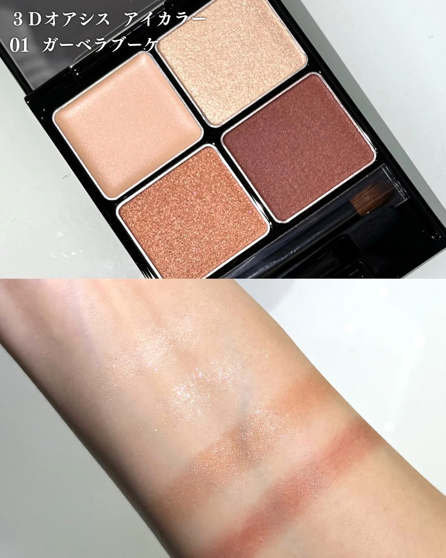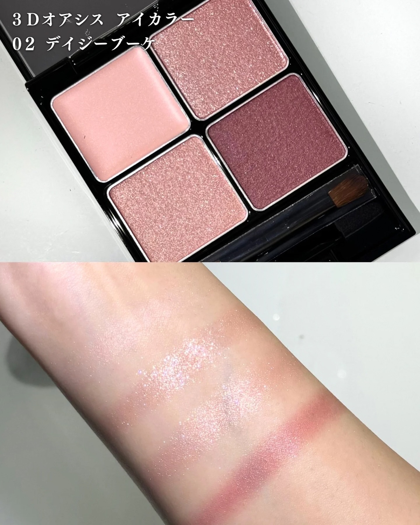 右上のピンクラメをベースに仕込んでメイクしたんだけどツヤと煌めき感えぐすぎる😳💎可愛い、、 そこに右下のカラーを重ねるとじんわり血色感が滲み出るような目元になるよ🦩 これは欠品店舗続出しそう🫣