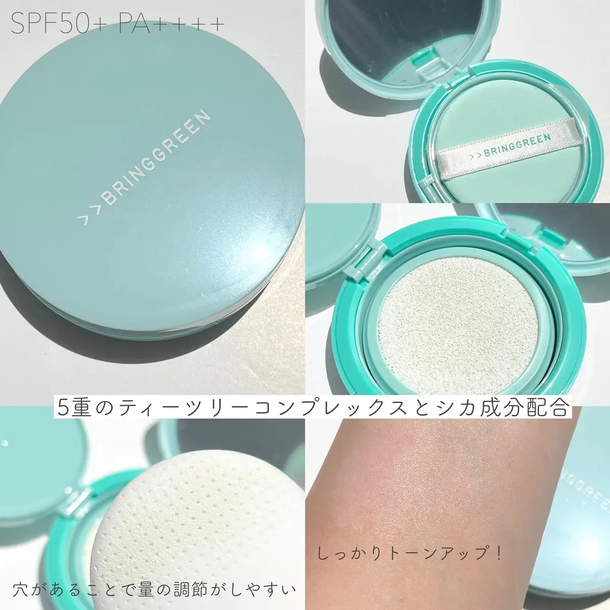 BRINGGREENティーツリーシカトーンアップサンクッションspf50+PA++++ブリングリーンの日焼け止めクッションミントっぽさのある白いカラーでしっかりトーンアップしてくれるんです₍ᵔ-̫-ᵔ₎♡クッションタイプだから手が汚れずに全体...
