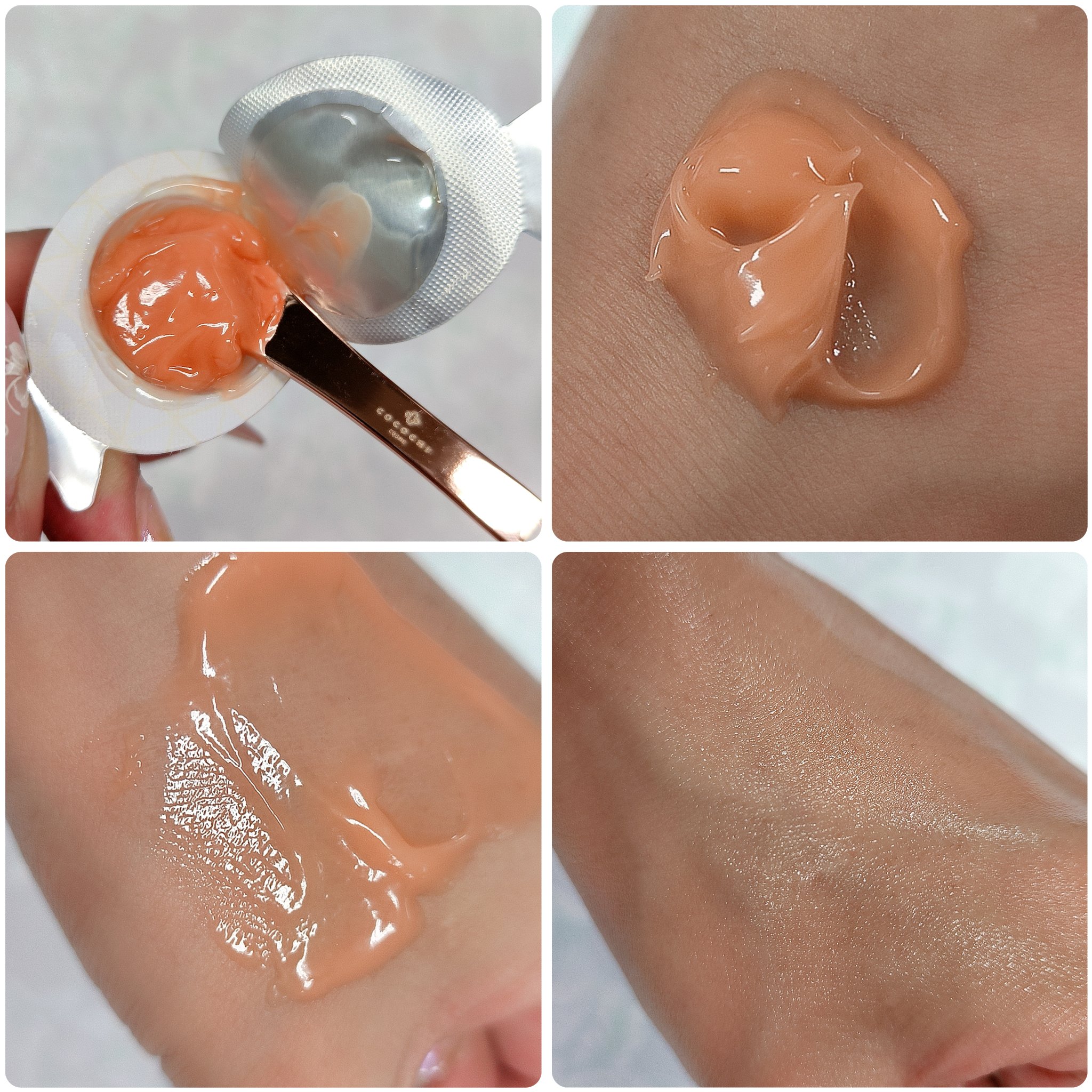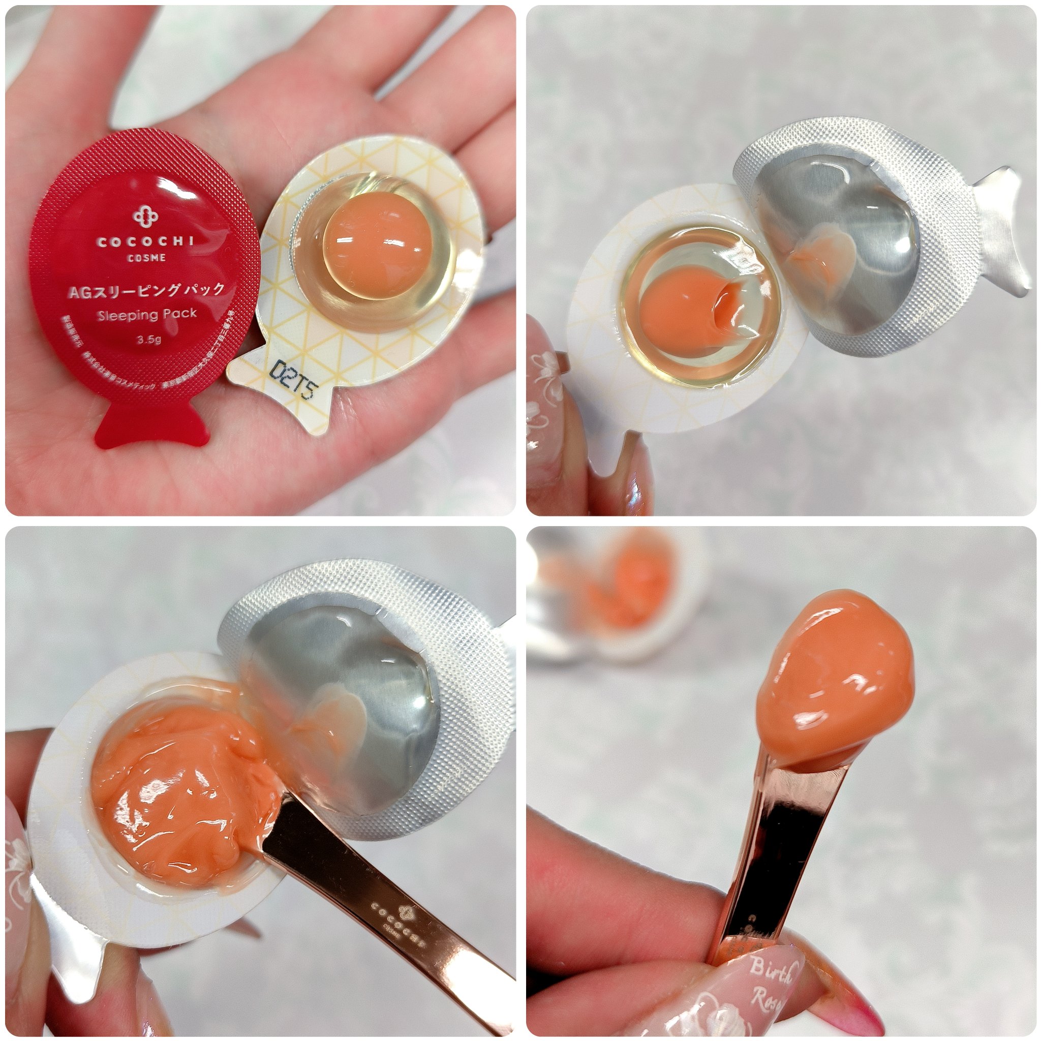 - <ココチ AG スリーピングパック N> 水、BG、エタノール、テトラエチルヘキサン酸ペンタエリスリチル、グリセリン、DPG、ビスPEG-18メチルエーテルジメチルシラン、ジメチコン、トリエチルヘキサノイン、シクロヘキサシロキサン、セテアリルアルコール、(C14-22)アルコール、カルボマー、フェノキシエタノール、セルロース、ポリアクリレート-13、トロメタミン、1,2-ヘキサンジオール、ペンチレングリコール、ポリイソブテン、(C12-20)アルキルグルコシド、シクロペンタシロキサン、ナイアシンアミド、EDTA-2Na、(アクリル酸ヒドロキシエチル/アクリロイルジメチルタウリンNa)コポリマー、ポリソルベート20、ポリシリコーン-11、イソステアリン酸ソルビタン、シリカ、コーン油、β-カロチン、ポリクオタニウム-51、ヒアルロン酸Na、水溶性プロテオグリカン、トリ(カプリル酸/カプリン酸)グリセリル、シアノコバラミン、アスタキサンチン、パルミトイルペンタペプチド-4、香料、ベニバナ赤、酸化鉄