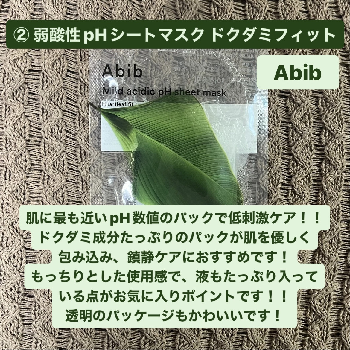 Abib弱酸性pHシートマスクドクダミフィットこのパック久しぶりに使用しましたが個人的に一番好きなパックかもです!シートはかなり厚みがあってしっかりしてます!液はひったひたで長時間つけてても乾燥しにくい分厚いシートなのに肌に密着してはがれにく...