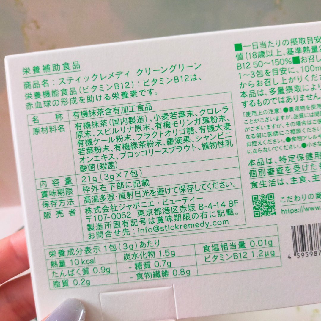 13種類の原料がブレンドされていて モリンガやスピルリナ クロレラなどが含まれることによってクレンズ効果を期待できるブレンドみたい(´・∀・) ビタミンB12が豊富に含まれた栄養機能食品で赤血球の形成を助ける栄養素だから貧血の方にもおすすめなんだって⸜(*˙꒳˙*)⸝ ほんとすっきりしていてほんのり甘みあって飲みやすい.ᐟ.ᐟ 粉っぽさはそんなに気にならないよ✧*。