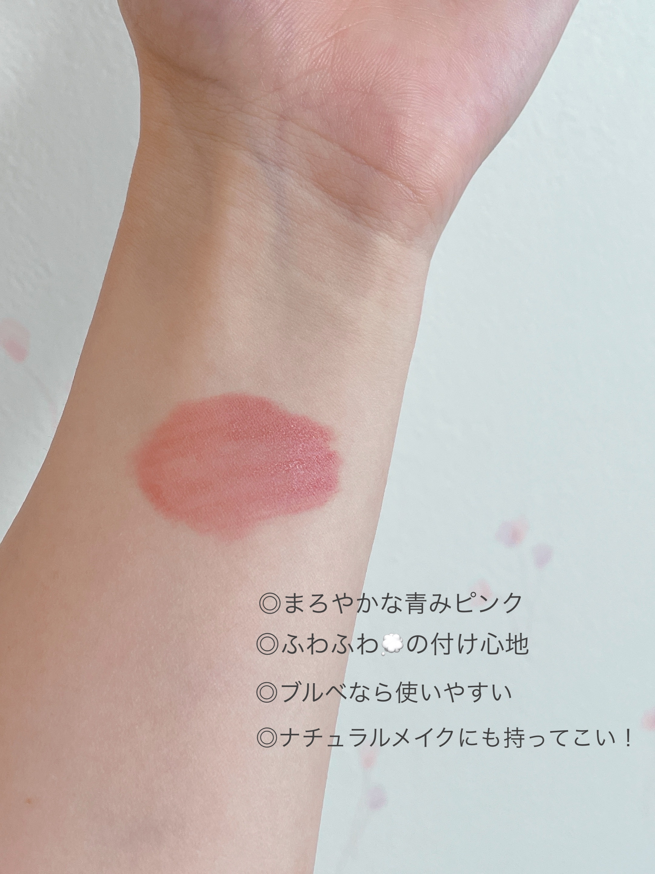 色持ちは本当にいいと思います!マスクしても水を飲んでも落ちない✨ マットだけどパサパサしすぎないふわふわな質感.。.:*♡ 何よりこのリップのすごいところはマット苦手さんでも使えるところです! まずチップが小さくて塗りやすい!!!! このふわふわな質感のお陰で私の薄すぎる唇にも変に浮かずに馴染みました😭