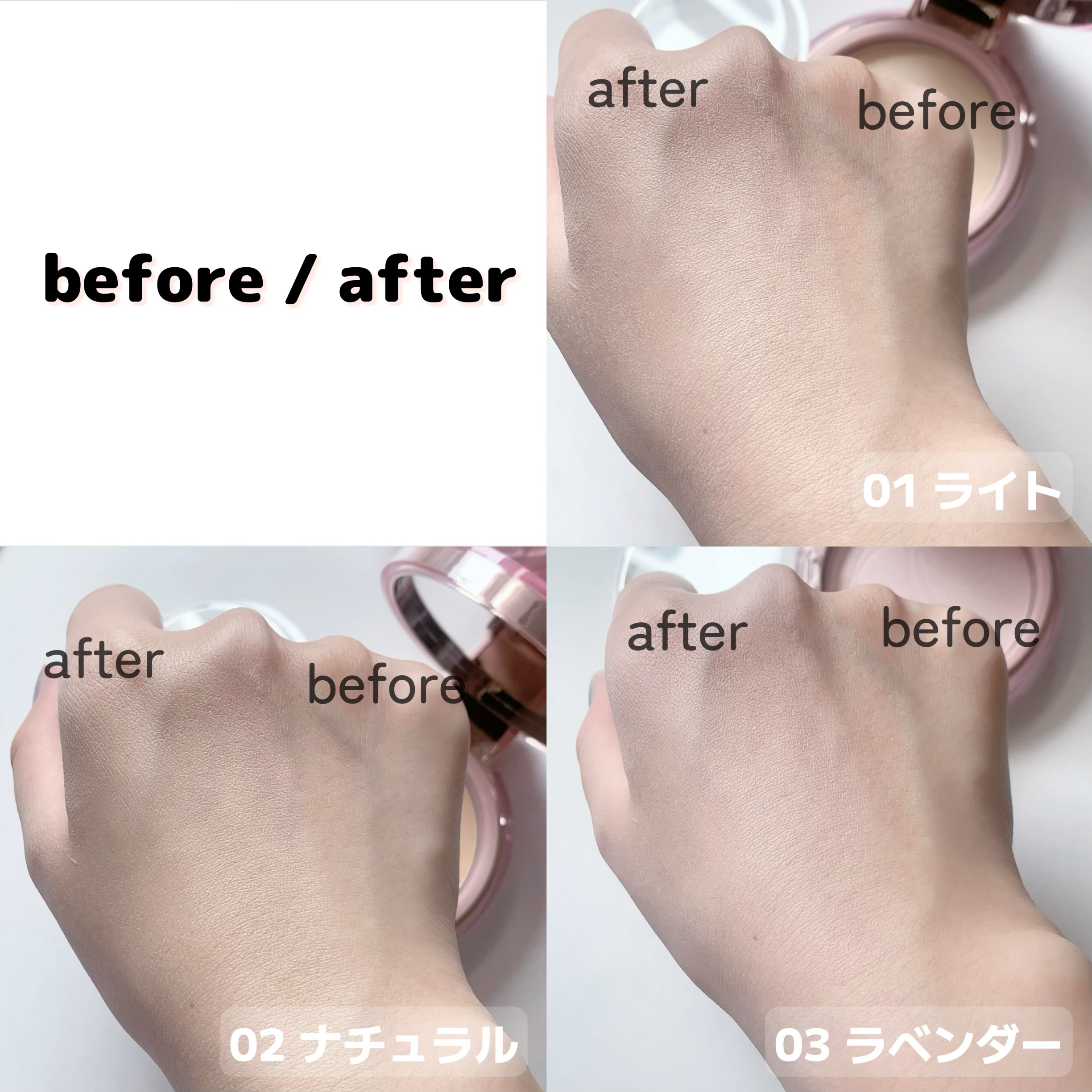 - <01 ライト> タルク、マイカ、トリ(カプリル酸/カプリン酸)グリセリル、窒化ホウ素、シリカ、ジメチコン、ナイロンー12、メタクリル酸メチルクロスポリマー、合成ミツロウ、リンゴ酸ジイソステアリル、カプリル酸グリセリル、エチルヘキシルグリセリン、ステアリン酸ジメチコノール、水、酢酸トコフェロール、ダイヤモンド末、ハスエキス、BG、1,2ーヘキサンジオール、ペンチレングリコール、ヒアルロン酸Na、モモ果実エキス、ヒドロキシアセトフェノン、フェノキシエタノール、アセチルヒアルロン酸N a、加水分解ヒアルロン酸、加水分解ヒアルロン酸Na、ヒアルロン酸、酸化鉄、酸化チタン、香料 <02 ナチュラル> タルク、マイカ、トリ(カプリル酸/カプリン酸)グリセリル、窒化ホウ素、シリカ、ジメチコン、ナイロンー12、メタクリル酸メチルクロスポリマー、合成ミツロウ、リンゴ酸ジイソステアリル、カプリル酸グリセリル、エチルヘキシルグリセリン、ステアリン酸ジメチコノール、水、酢酸トコフェロール、ダイヤモンド末、ハスエキス、BG、1,2ーヘキサンジオール、ペンチレングリコール、ヒアルロン酸Na、モモ果実エキス、ヒドロキシアセトフェノン、フェノキシエタノール、アセチルヒアルロン酸N a、加水分解ヒアルロン酸、加水分解ヒアルロン酸N a、ヒアルロン酸、酸化鉄、酸化チタン、香料 <03 ラベンダー> タルク、マイカ、トリ(カプリル酸/カプリン酸)グリセリル、窒化ホウ素、シリカ、ジメチコン、ナイロンー12、メタクリル酸メチルクロスポリマー、合成フルオロフロゴパイト、合成ミツロウ、リンゴ酸ジイソステアリル、カプリル酸グリセリル、エチルヘキシルグリセリン、ステアリン酸ジメチコノール、酢酸トコフェロール、ダイヤモンド末、水、ハスエキス、BG、ローブッシュブルーベリー果実エキス、クマイチゴ果実エキス、マグワ果実エキス、1,2ーヘキサンジオール、ペンチレングリコール、ヒアルロン酸Na、ヒドロキシアセトフェノン、フェノキシエタノール、アセチルヒアルロン酸N a、加水分解ヒアルロン酸、加水分解ヒアルロン酸Na、ヒアルロン酸、酸化チタン、グンジョウ、赤201、香料
