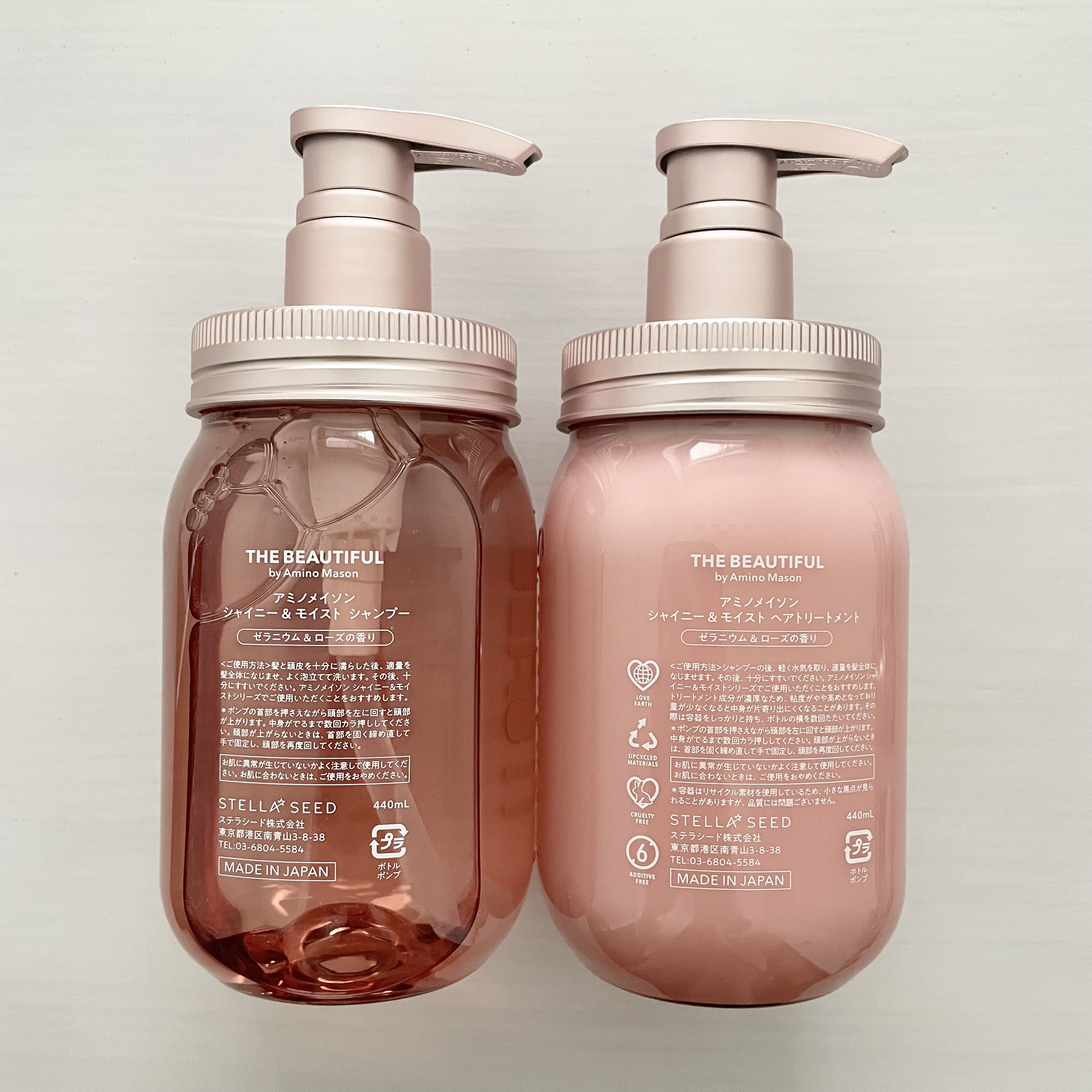 - 髪の印象変わる*1、神艶*2レシピのシャンプー&トリートメント。 コールドプレスのパワーシードオイル*3×NEOスーパーアミノ酸ブレンドで、うねり・広がり・パサつきによる髪ストレスもフリーに。 艶やかで毛先までしっとりまとまる髪へと導きます。 豊かな泡立ちのシャンプーで不要な皮脂や汚れをすっきり落として健やかな地肌環境へ整え、トリートメントで髪を包み込むように潤いでコーティングしダメージを補修。 まるで髪の質感*1が変わったような、私らしい美しい髪へと導きます。 ゼラニウム&ローズの香り。 *1 潤い・まとまりなどの髪の仕上がりや手触りのこと *2 当社比 *3 プルケネチアボルビリス種子油、ホホバ種子油、テリハボク種子油、スクレロカリアビレア種子油/ブロッコリー種子油、スイカ種子油、プルーン種子油[アミノメイソン シャイニー & モイスト シャンプーに配合]/オプンチアフィクスインジカ種子油、ヒマワリ種子油[アミノメイソン シャイニー & モイスト ヘアトリートメントに配合]