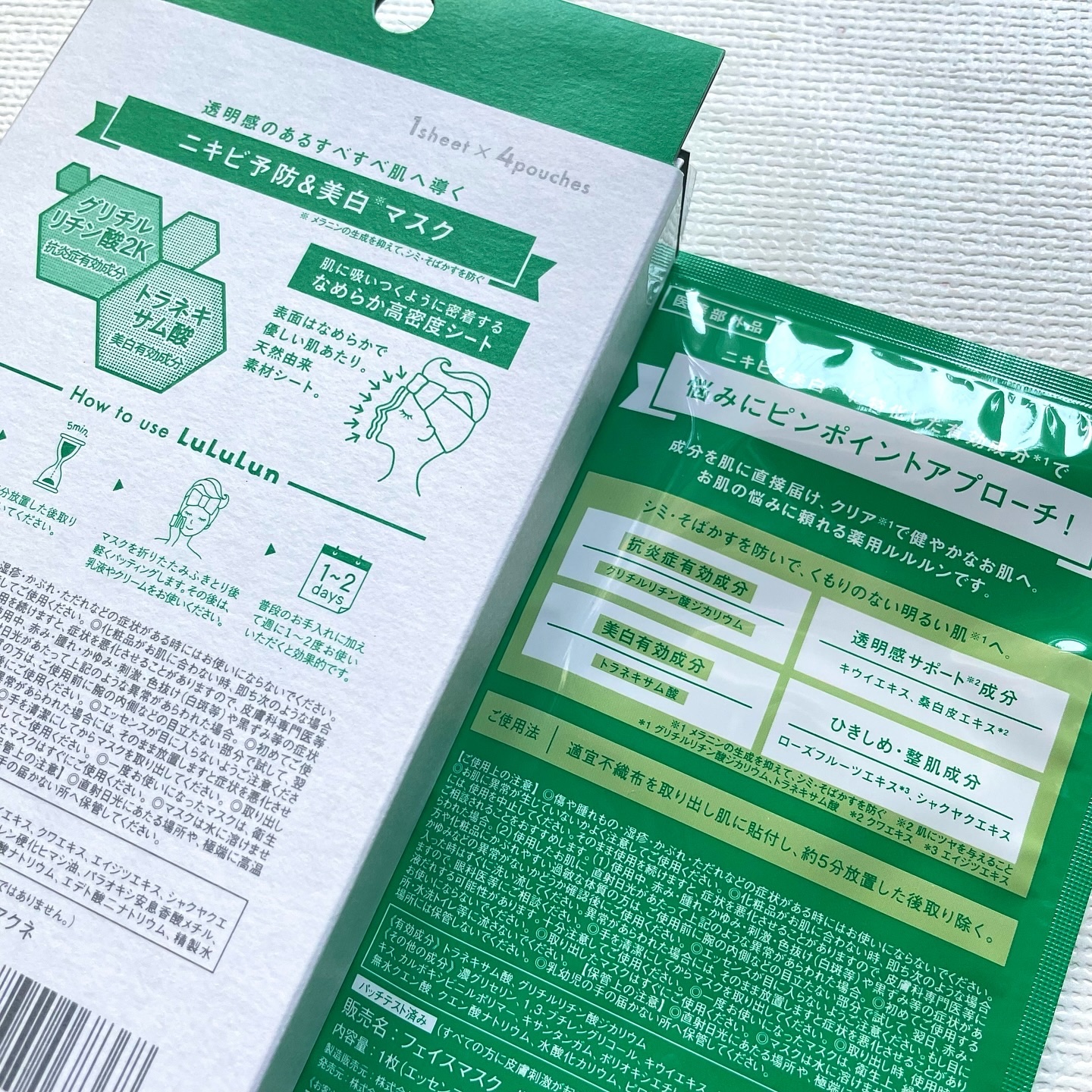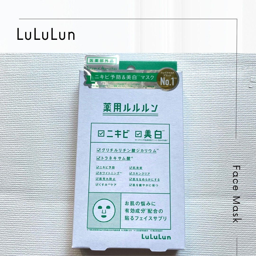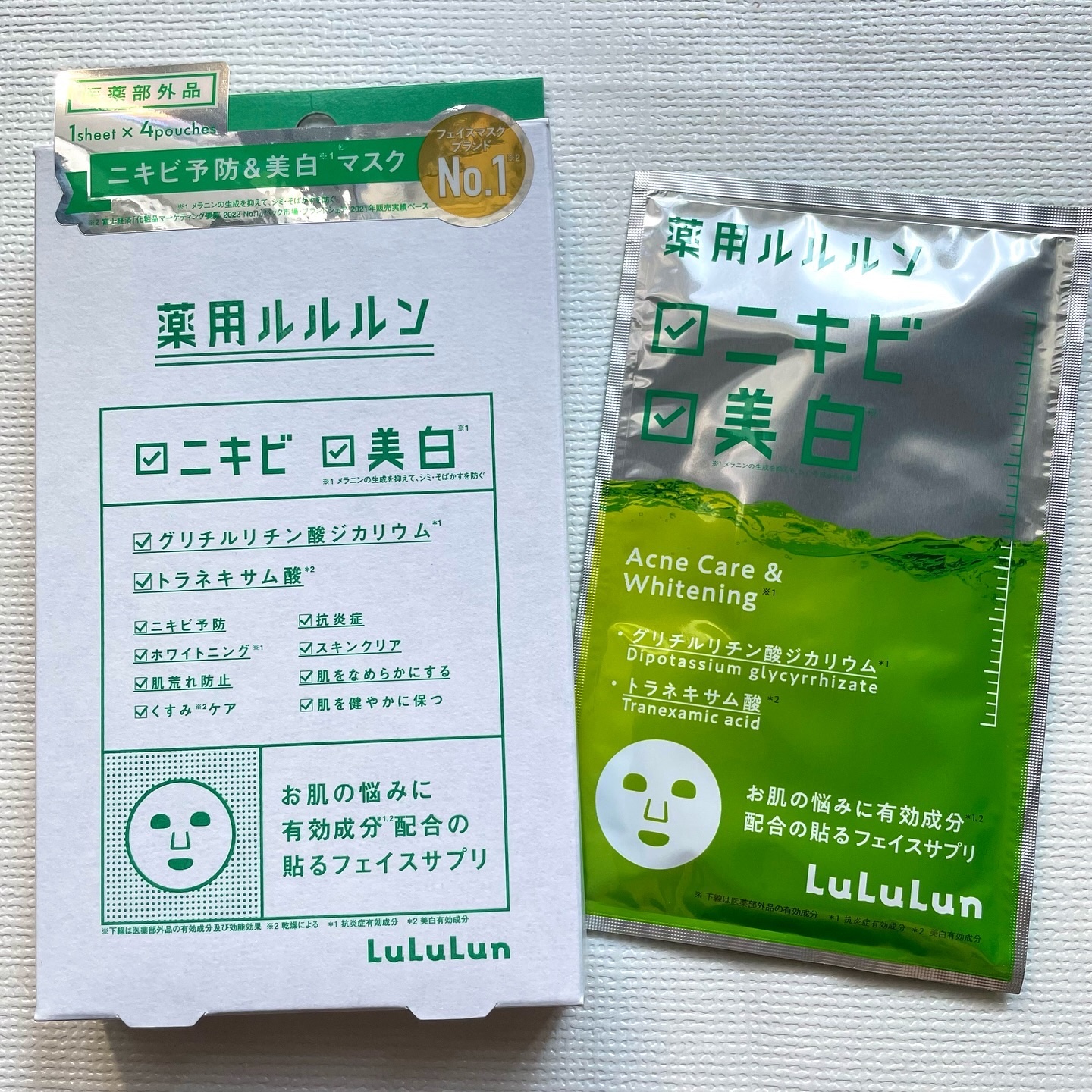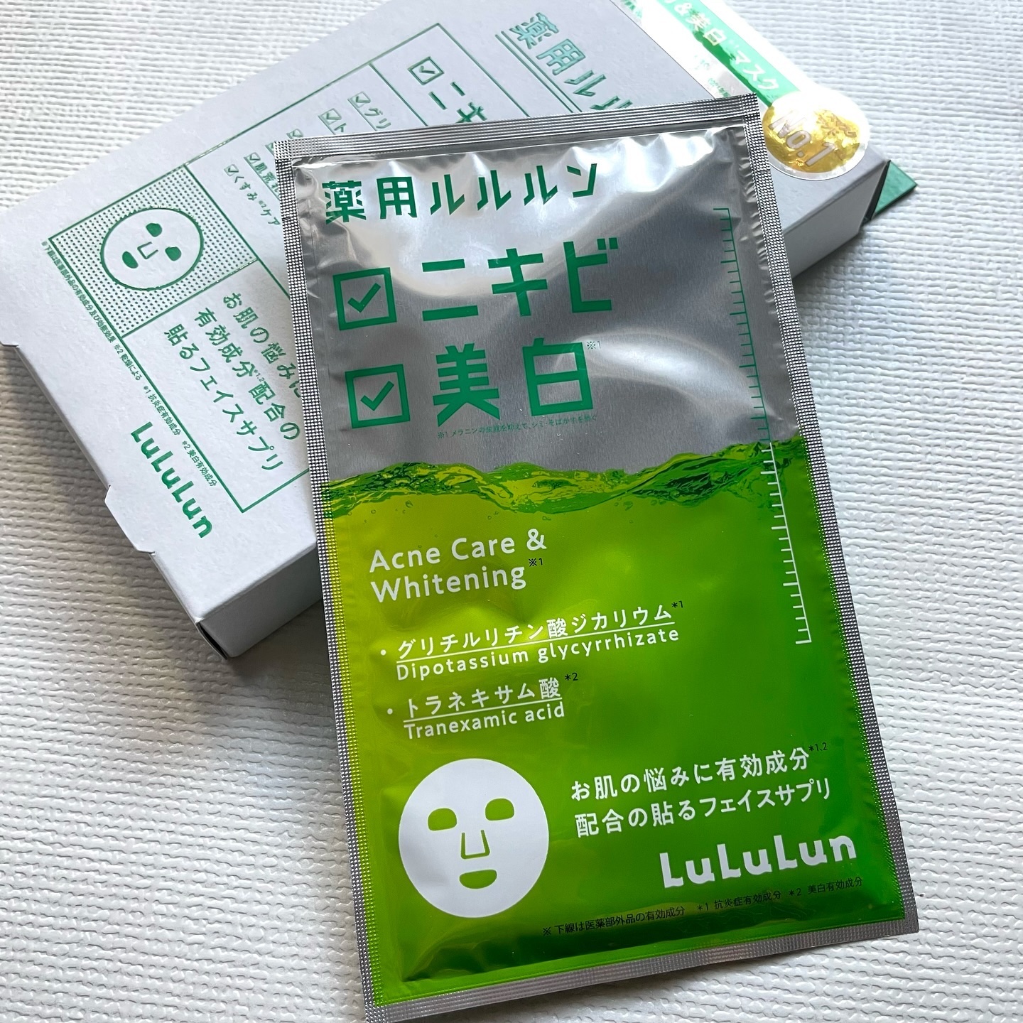 - 【医薬部外品】 ルルルン初の医薬部外品、「薬用ルルルン」が登場。 「薬用ルルルン 美白アクネ」はニキビを予防したい方、美白※1・くすみ※2をケアしたい方におすすめ。 (※1 メラニンの生成を抑えて、シミ・そばかすを防ぐ ※2乾燥による)