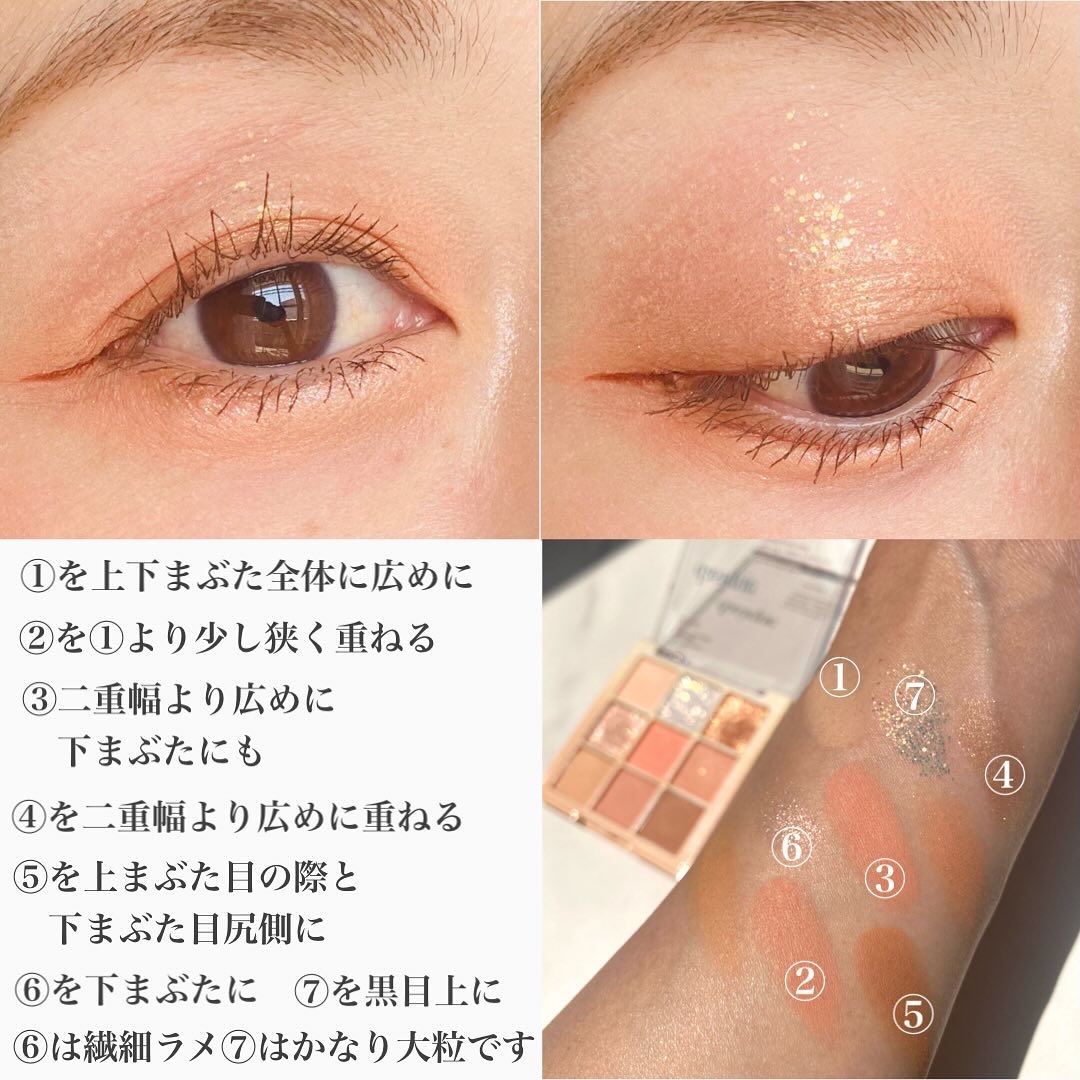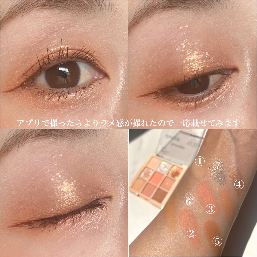 マットは肌に溶け込むような粉質でボソボソしません! シマーのしっとりした粉質も密着してくれて好き!!! 1番キラキラなのは右上のラメですね🍑💓でも粒が大きくないので、大人も使いやすいラメだと思います🥰 どの色使おうか迷うけど、どれ使っても本当可愛くて、自分が桃になったかのような🍑(笑)多幸感あふれるパレットです💘