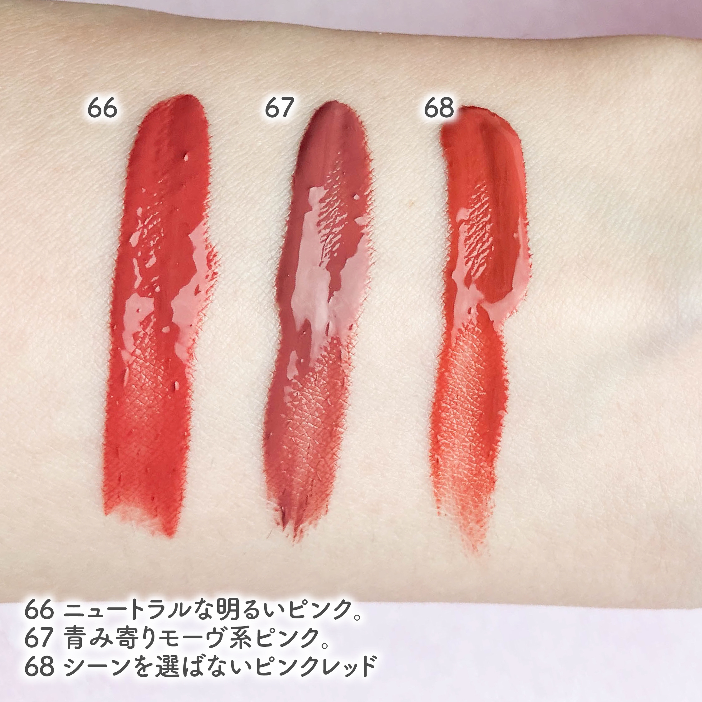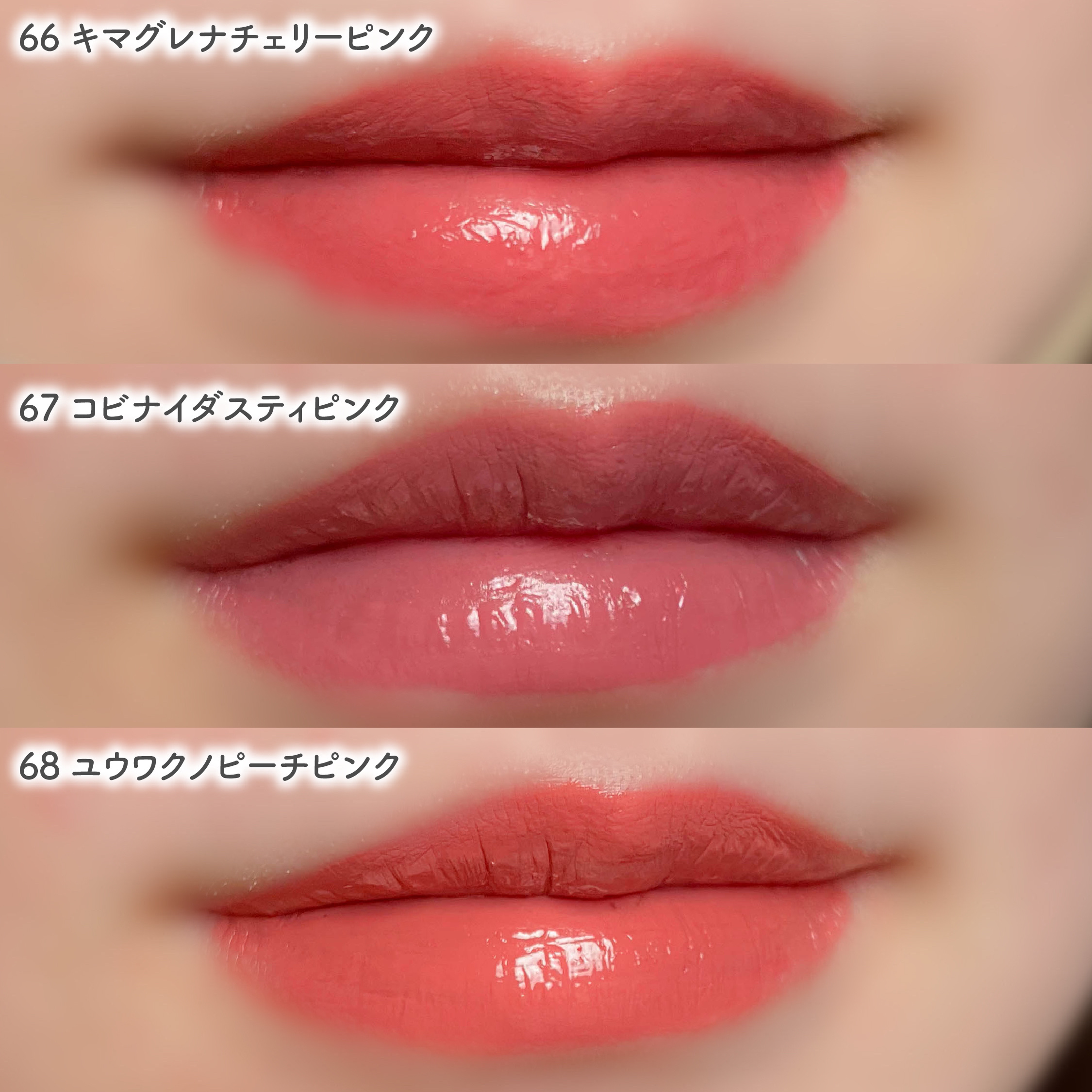 このリップ、すごい話題ですよね! うるうるちゅるんちゅるんでとっても可愛い🥺 *01ココヌード ヌードベージュ。発色は淡め。 ミルクティーみたいなピンクベージュに。 *03ソルベバーム 王道ピンク。赤みすぎず黄色みすぎず誰にでも合いそうな色。 *05ヌガーサンド 見た目ブラウンだけど唇に塗ると自分の唇の色に近く、少し血色を足して補正してくれるような色味。 *06カヤフィグ 05に少しローズを足したような色。可愛くなりすぎない落ち着いたローズピンク。 *07モーブホイップ 結構青み強く見えるけど唇に塗るとほぼ青みを感じないピンク。イエベさんが青みよりのメイクにしたい時に使いやすそう。普通に使いやすい。 全体的に溶けるような使用感。つやぷるリップより柔らかく、減りが結構早いです。 あと、少しだけ甘い匂いが付いています。 とっても可愛いですが、唯一の欠点はマスクにはべっとり付いてしまうのでマスク派の人は注意です!