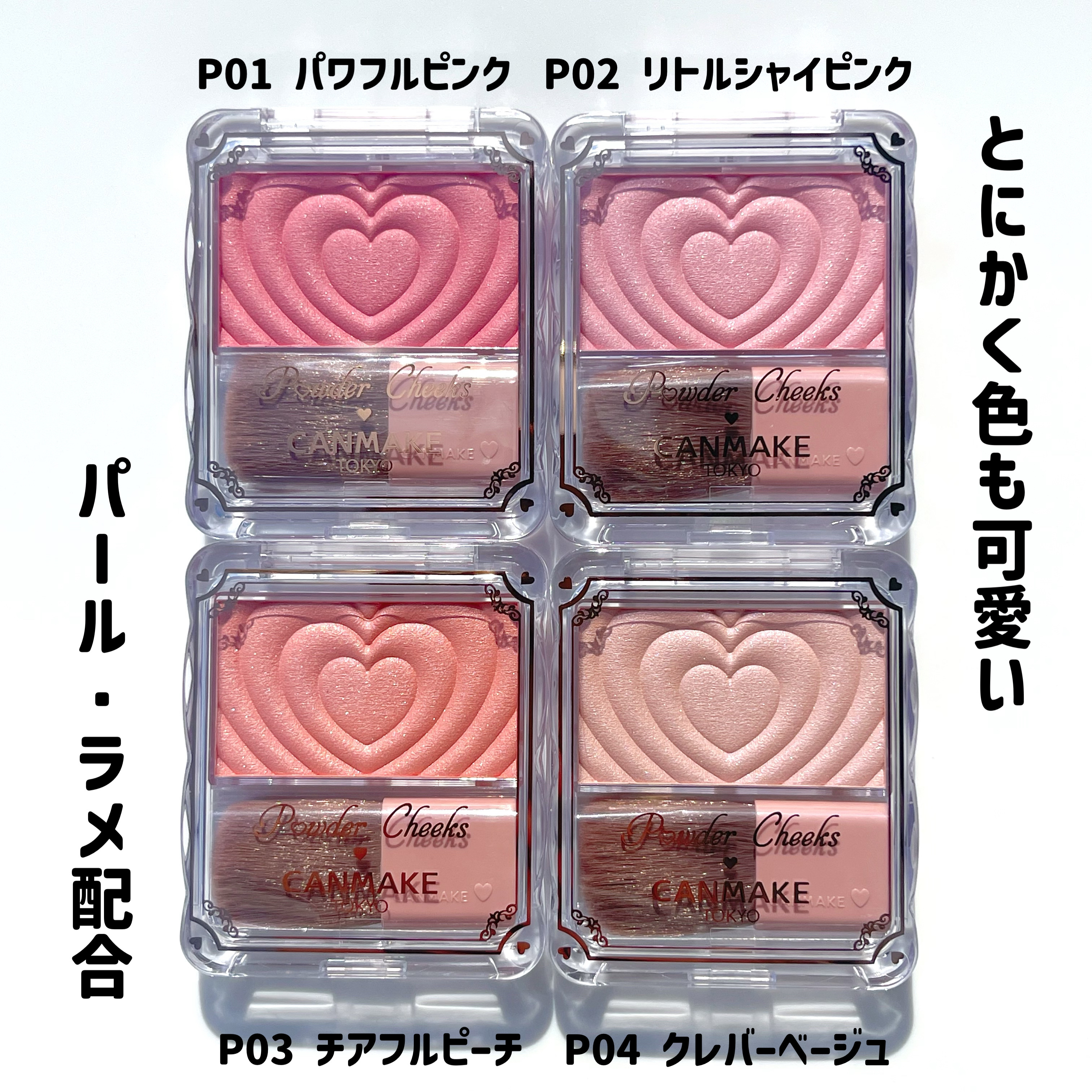 見た目がハート型で可愛いのに 粉質はしっとり付属のブラシもチクチクせず塗布できて660円はすごい🌸 透け感のあるツヤ仕上がりで P04はハイライトとして使うのも◎ 全部色味の違うピンクカラーでその日の気分やメイクに合わせて使い分けてる🌷