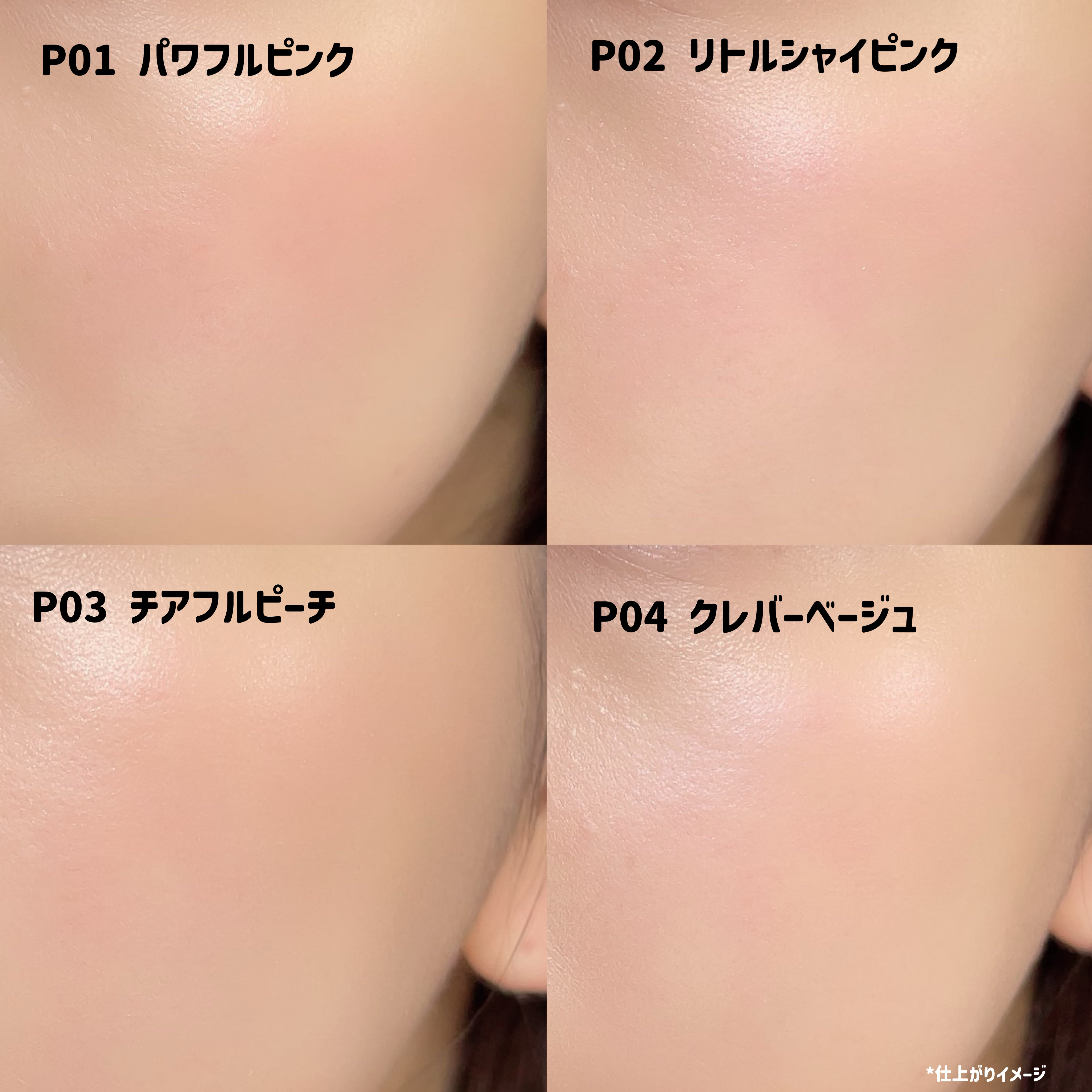 - <P01 パワフルピンク> タルク、リンゴ酸ジイソステアリル、合成フルオロフロゴパイト、トリエチルヘキサノイン、イソステアリン酸水添ヒマシ油、ポリグリセリル-3ポリジメチルシロキシエチルジメチコン、ラウリン酸亜鉛、メチルパラベン、酸化スズ、トコフェロール、オリーブ果実油、カニナバラ果実油、セラミドNP、シア脂、ホホバ種子油、マイカ、グンジョウ、酸化チタン、酸化鉄、赤202、赤226 <P02 リトルシャイピンク> タルク、リンゴ酸ジイソステアリル、トリエチルヘキサノイン、イソステアリン酸水添ヒマシ油、ポリグリセリル-3ポリジメチルシロキシエチルジメチコン、ラウリン酸亜鉛、メチルパラベン、トコフェロール、オリーブ果実油、カニナバラ果実油、セラミドNP、シア脂、ホホバ種子油、マイカ、グンジョウ、酸化チタン、水酸化Al、酸化鉄、赤226 <P03 チアフルピーチ> タルク、リンゴ酸ジイソステアリル、トリエチルヘキサノイン、イソステアリン酸水添ヒマシ油、ポリグリセリル-3ポリジメチルシロキシエチルジメチコン、ラウリン酸亜鉛、合成フルオロフロゴパイト、メチルパラベン、トコフェロール、オリーブ果実油、カニナバラ果実油、セラミドNP、シア脂、ホホバ種子油、酸化スズ、マイカ、酸化チタン、酸化鉄、赤226 <P04 クレバーベージュ> タルク、リンゴ酸ジイソステアリル、トリエチルヘキサノイン、イソステアリン酸水添ヒマシ油、ポリグリセリル-3ポリジメチルシロキシエチルジメチコン、ラウリン酸亜鉛、メチルパラベン、トコフェロール、オリーブ果実油、カニナバラ果実油、セラミドNP、シア脂、ホホバ種子油、マイカ、グンジョウ、酸化チタン、酸化鉄、赤226 <P05 クラッシーモーヴピンク> タルク、リンゴ酸ジイソステアリル、トリエチルヘキサノイン、イソステアリン酸水添ヒマシ油、ポリグリセリル-3ポリジメチルシロキシエチルジメチコン、ラウリン酸亜鉛、メチルパラベン、トコフェロール、オリーブ果実油、カニナバラ果実油、セラミドNP、シア脂、ホホバ種子油、マイカ、酸化鉄、酸化チタン、水酸化Al、グンジョウ、赤226 <P40thx キューティーベリー> タルク、リンゴ酸ジイソステアリル、トリエチルヘキサノイン、イソステアリン酸水添ヒマシ油、合成フルオロフロゴパイト、ポリグリセリル-3ポリジメチルシロキシエチルジメチコン、ラウリン酸亜鉛、メチルパラベン、トコフェロール、オリーブ果実油、カニナバラ果実油、セラミドNP、シア脂、ホホバ種子油、マイカ、酸化チタン、赤226、グンジョウ、酸化鉄、水酸化Al
